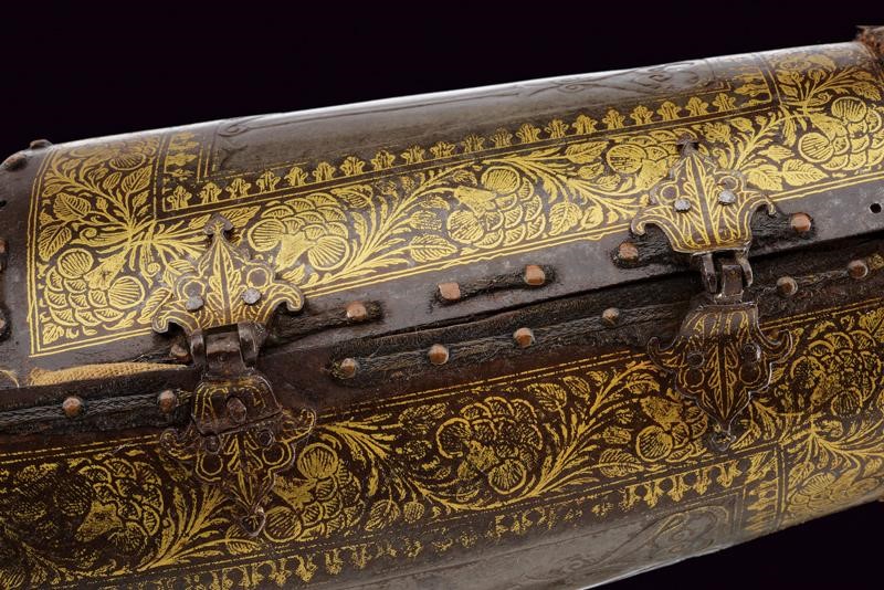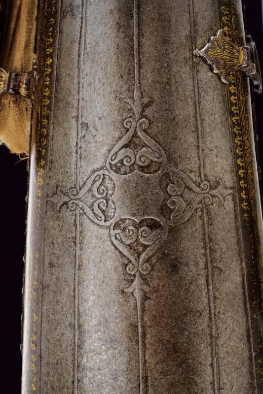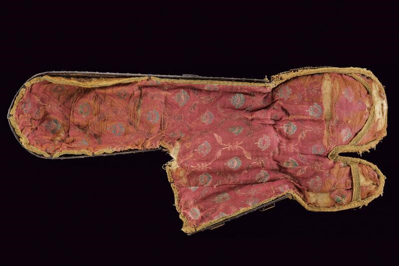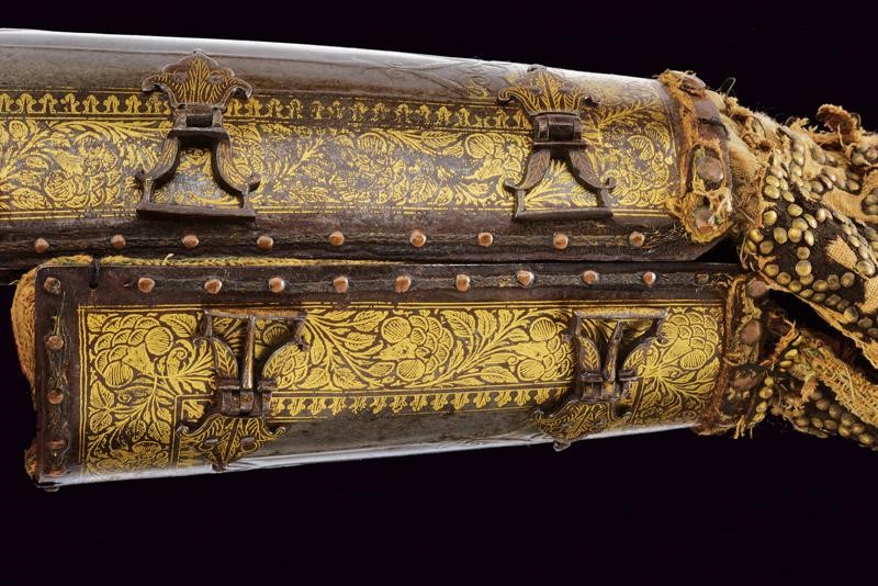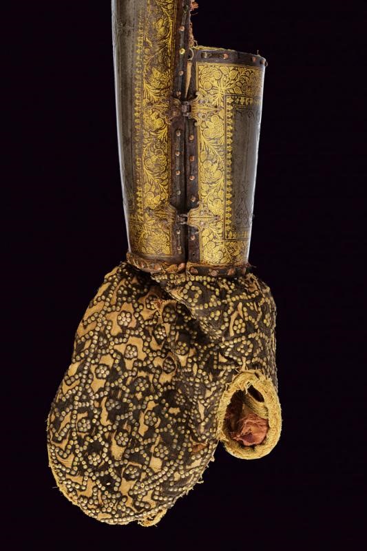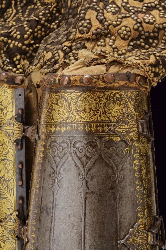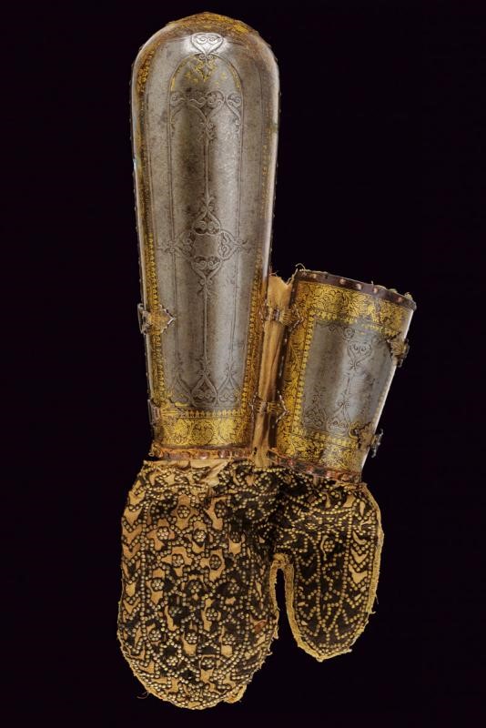 In ferro, costituiti da due piastre congiunte tramite due cerniere. Entrambi gli elementi lavorati con decorazioni in bassorilievo a motivi geometrici nella parte centrale (con una piccola mancanza su uno dei bracciali), dotati di bordi ornati con finissime decorazioni in oro a motivi geometrici e floreali (residui di doratura sono visibili anche nelle aree centrali). Il margine esterno delle piastre delineato da una sottile banda in cuoio tenuta da una serie di ribattini in ottone. Le quattro cerniere, disposte a coppie, sono fissate con ribattini e risultano in rilievo, intagliate a forma di fiore e dorate. È ancora presente, in entrambi i bazu-band, la fodera interna e la protezione per la mano, quest'ultima in tessuto ed impreziosita da una trama squamata formata da piccoli dischi in ottone; la fodera, che presenta diversi strappi e segni d'uso, è costituita da un rivestimento interno in cotone, ricoperto da seta color porpora e decorata a motivi floreali in policromia.
