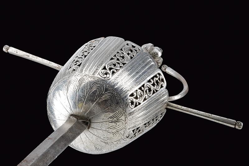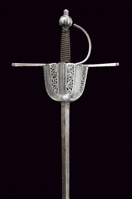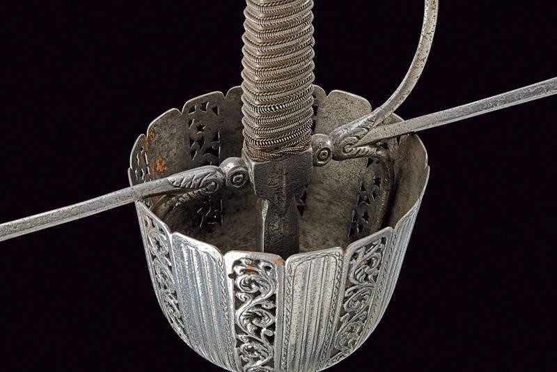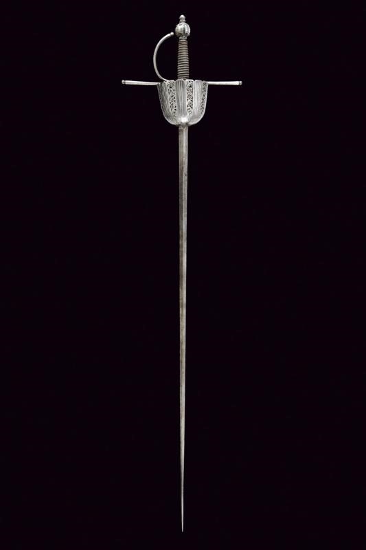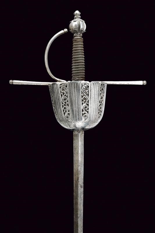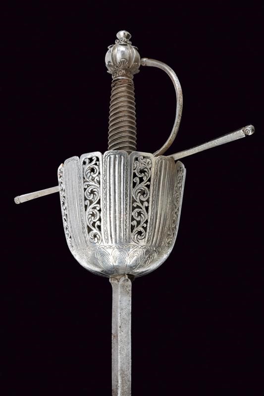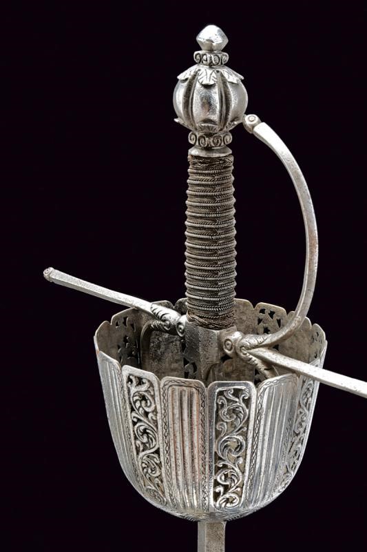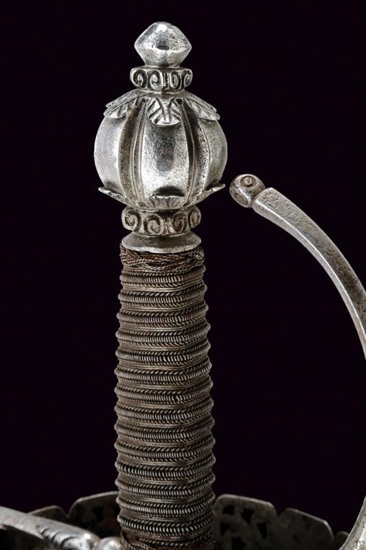 Lunga lama dritta a due fili di sezione a losanga; ricasso con due marchi su un lato e uno marchio sull'altro (poco visibile, probabilmente Toledo). Coccia di forma assai allungata, riccamente traforata, scanalata ed incisa a motivi floreali e geometrici; fissata all'interno con due archetti. Bracci dell'elso dritti e ramo di guardia di sezione a losanga, tutti con piccoli nodi alle estremità e con basi intagliate a fogliame. Bel pomo sferico con sei profonde scanalature nervate e con foglie intagliate poste ai poli. Impugnatura in legno rivestita con trecciola e dotata di teste di moro in fil di ferro.