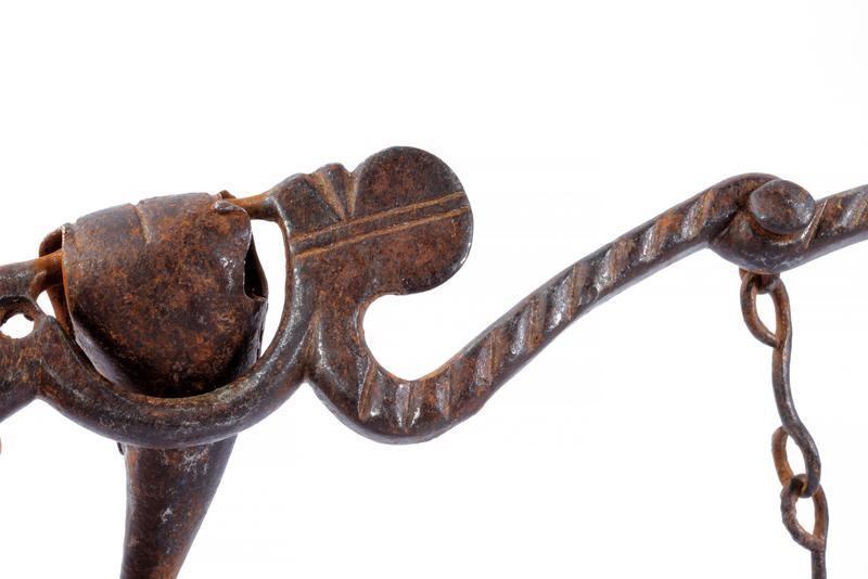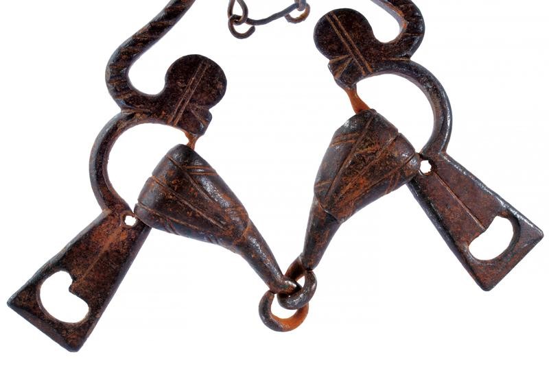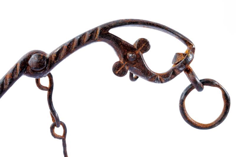 In ferro. Con imboccatura a due coni articolati e decorati a sottili decorazioni geometriche, le guardie intagliate e decorate a scanalature oblique. Catenella trasversale.