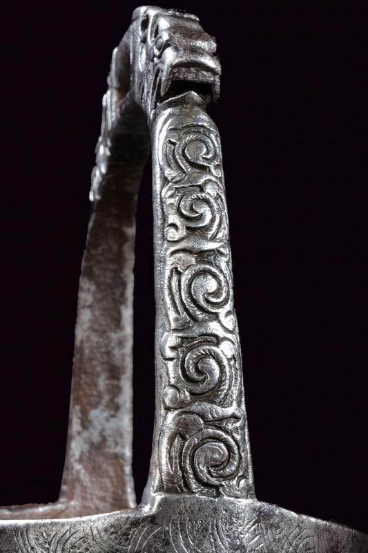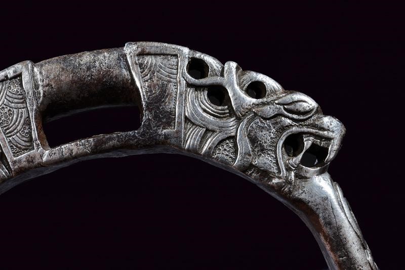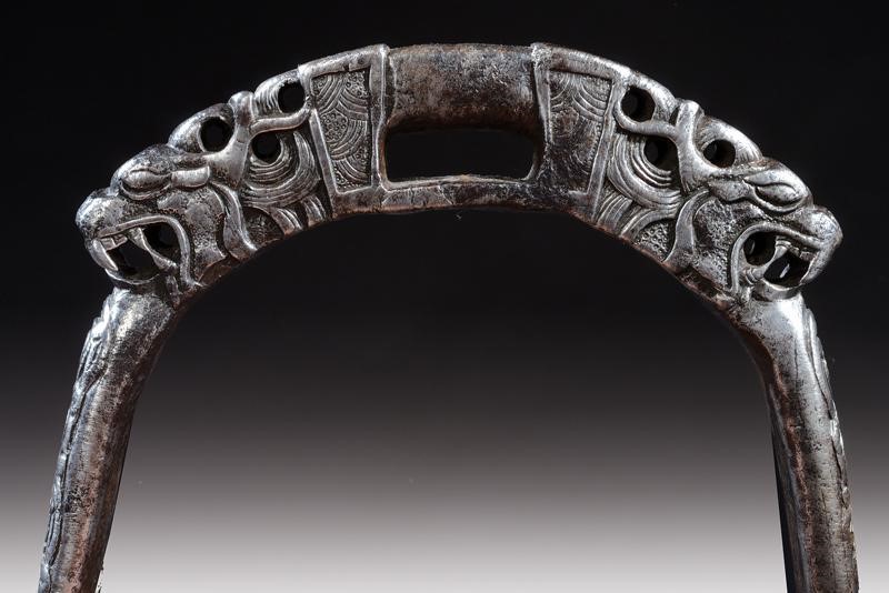 Pesante struttura in ferro, con panche circolari e bordo rialzato con resti di incisioni. Archi intagliati a racemi; occhi rettangolari affiancati da bellissime teste di drago finemente intagliate quasi a tuttotondo.