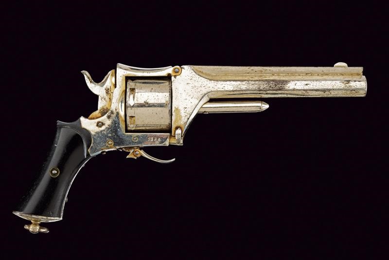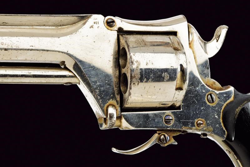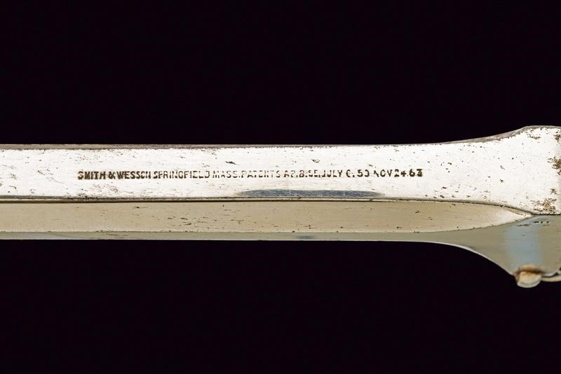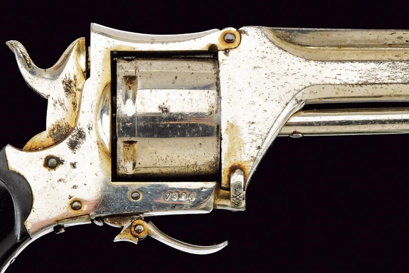 Canna ottagonale, rigata, con alta bindella marcata "SMITH & WESSON SPRINGFIELD MASS" e brevetti fino al 1863, cal. 44 S&W. Tamburo liscio a sei colpi con punzone del banco di prova di Liegi. Castello con matricola "73xx". Apertura della canna verso l'alto. Grilletto pieghevole. Guancette nere lisce. Anello di sospensione. Nichelatura al 90 %. Interessante e raro modello probabilmente fabbricato su licenza a Liegi.