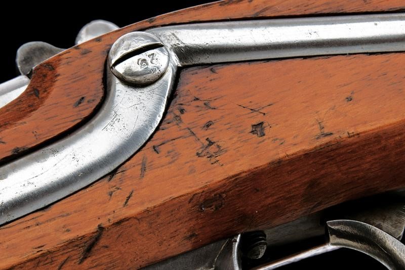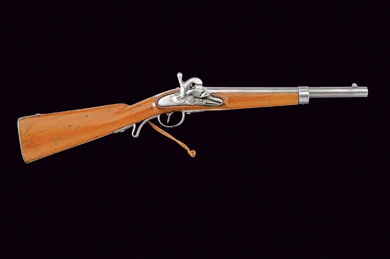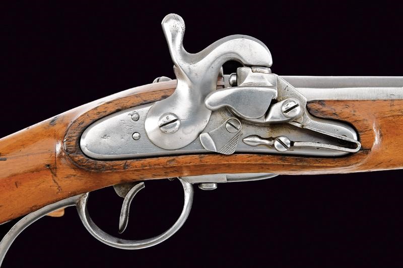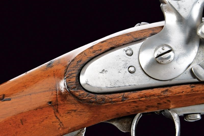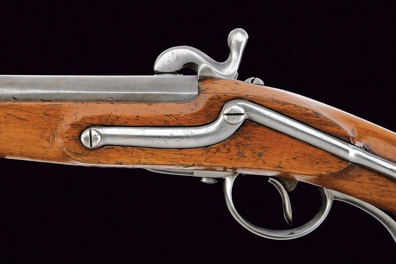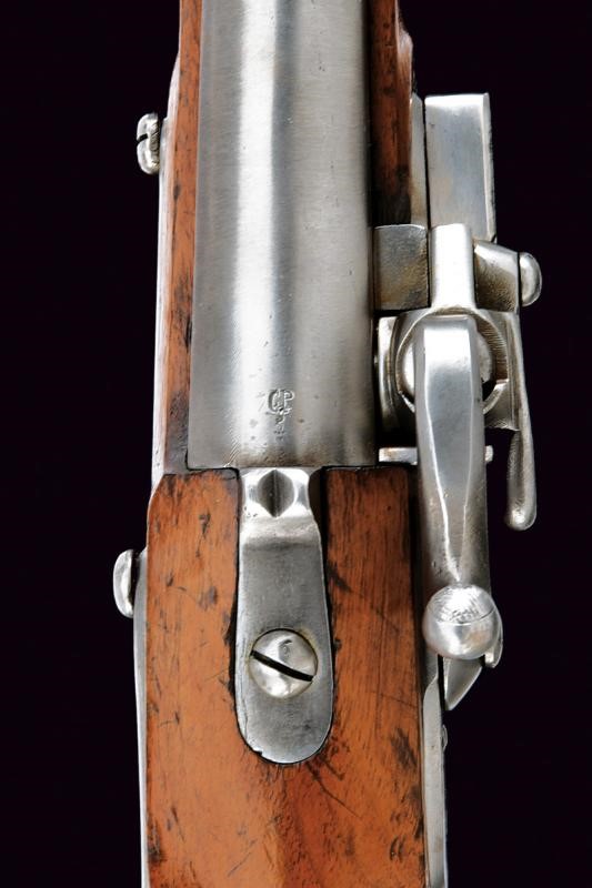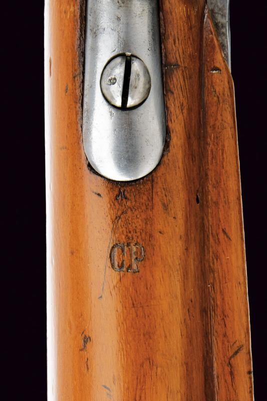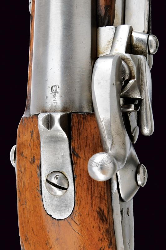 Corta canna tonda, liscia, con base quadra, marcata "CP" alla base, munita di altre marcature su lato sinistro, cal. 17 mm; codetta dotata di alzo. Batteria a molla in avanti a sistema Augustin, cartella con data "851" e punzone imperiale. Cassa in legno (segni d'uso e del tempo), timbro "CP" dietro al ponticello. Fornimenti in ferro. Anello da sella. Molto rara.