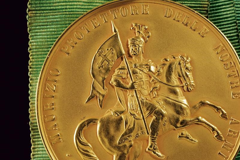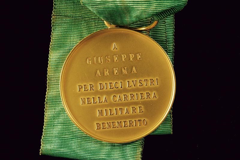 In oro. Sul recto S. Maurizio su cavallo con iscrizione "S. MAURIZIO PROTETTORE DELLE NOSTRIE ARMI". Opus: Ferraris. Sul retro "A GIUSEPPE ARENA PER DIECI LVSTRI NELLA CARRIERA MILITARE BENEMERITO". Punzone sul taglio "917". Su nastro verde. Oro 917/1000. 80 g. Rara.