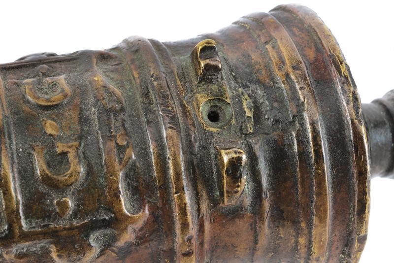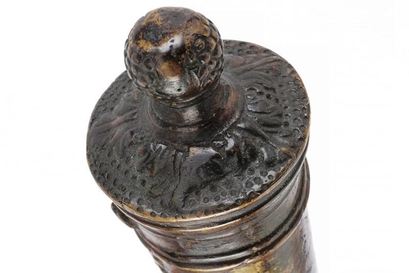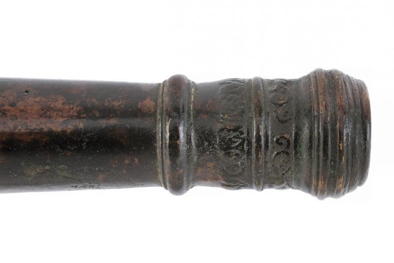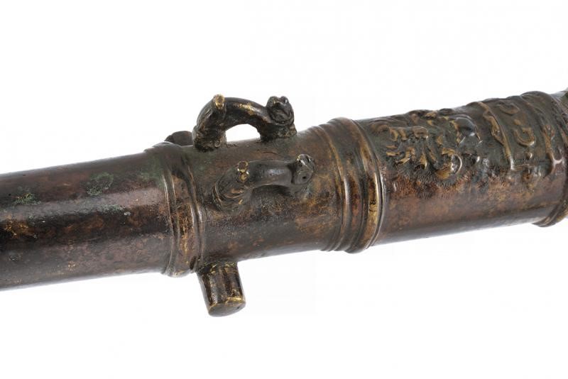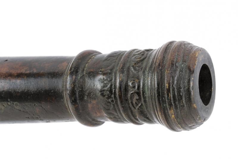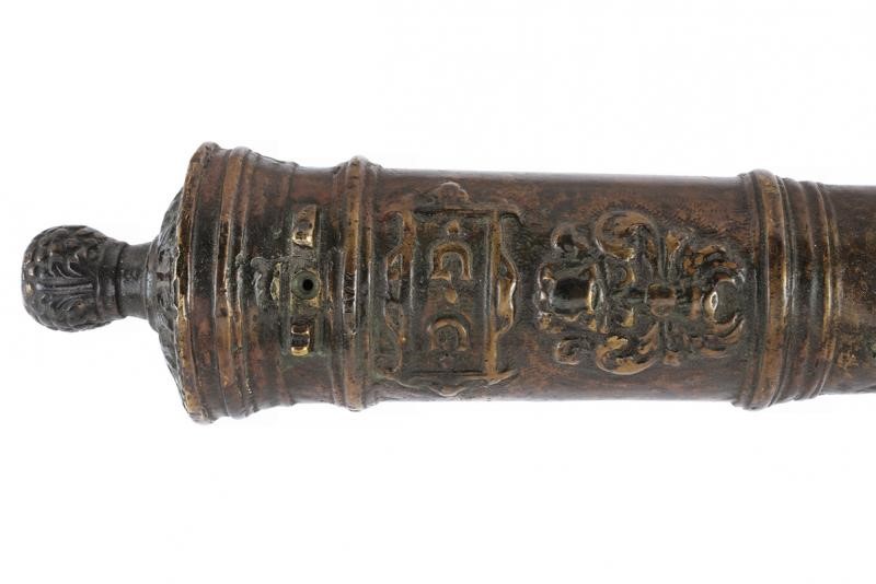 In bronzo, con canna quattro ordini inframezzati da anellature, la culatta con focone, monogramma "GG" e decorazioni floreali in bassorilievo; la volata con gioia di bocca e decorazioni floreali, orecchioni cilindrici, maniglioni a pesci stilizzati. Pomo di culatta a bocciolo.