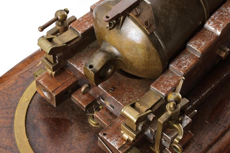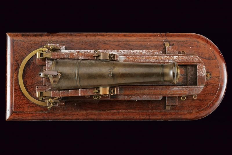 Canna in bronzo con focone e mirino, munita di orecchioni cilindrici. Montata su affusto e binario in ferro con fornimenti in bronzo, il binario è mobile in direzione longitudinale alla canna, questa invece è libera di ruotare lungo un piano trasversale al binario. Il tutto su base in legno. Gli elementi in ferro con ruggine superficiale. Tappo in bronzo per la chiusura della volata.