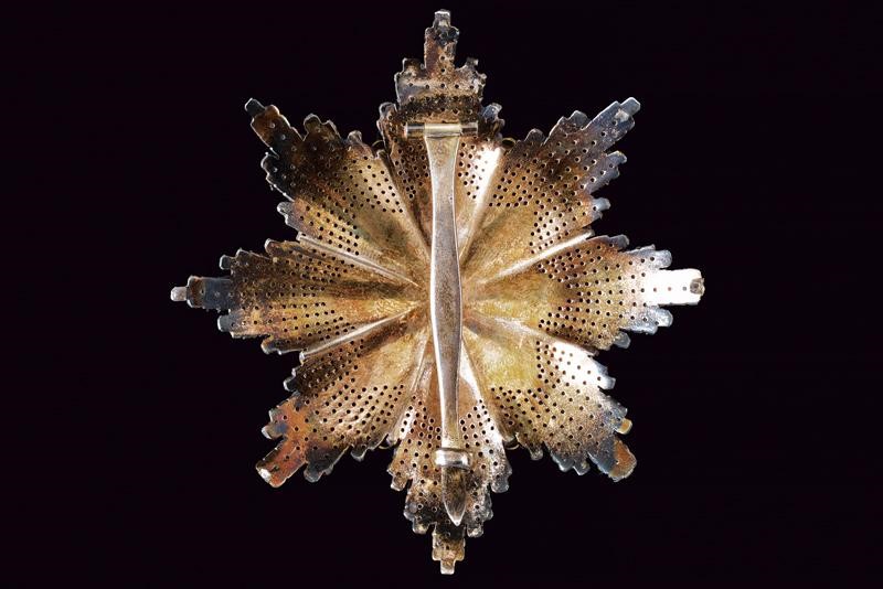 Placca da grand'ufficiale, del secondo tipo. Croce dorata e smaltata in biancoazzurro, con effige policroma del santo recante veste color verde e iscrizioni in cirillico. Placca in argento (piccole mancanze e danni alle punte) a decoro brillantato. Il retro con spilla verticale. Di buona fattura.