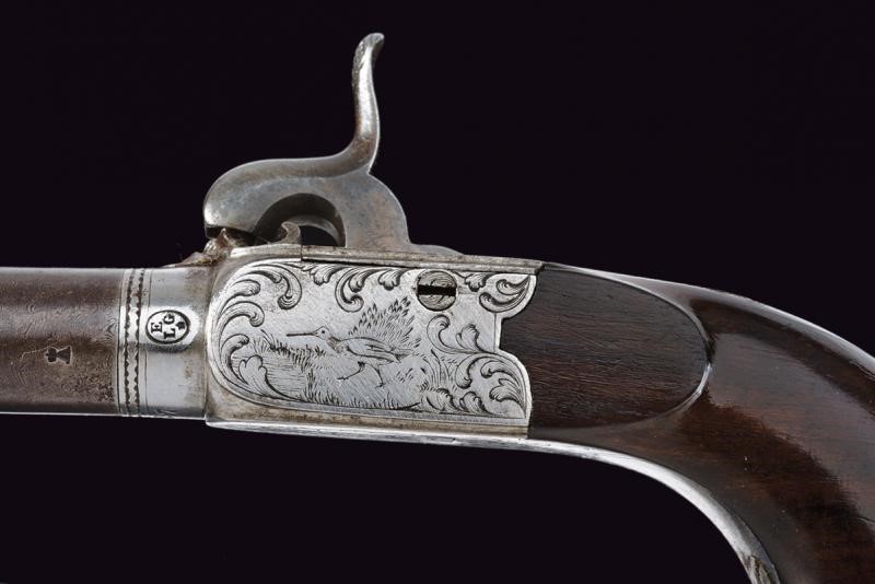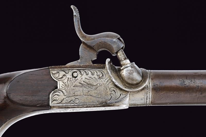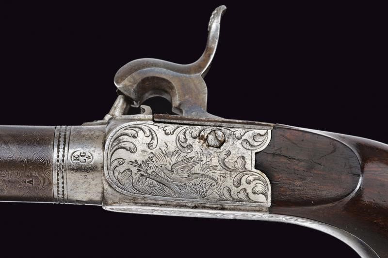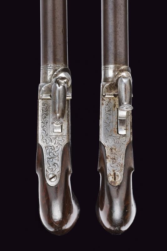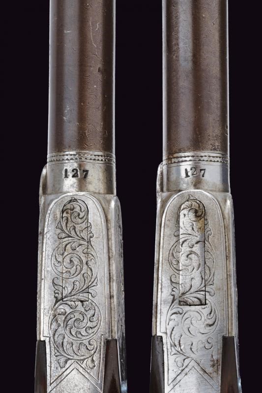 Lunghissime canne tonde, rigate (incrostazioni e leggero pitting), svitabili e in damasco; con punzone "A" coronato alla base , cal. 11.5 mm in volata. Castelli del tipo boxlock incisi a racemi e con volatili, marcati con il punzone del banco di prova di Liegi e "127". Cani dorsali, decentrati (verso destra). Con alzo fisso. Calci lisci in legno. Grilletti a scomparsa, cocce incise e munite di patchbox.