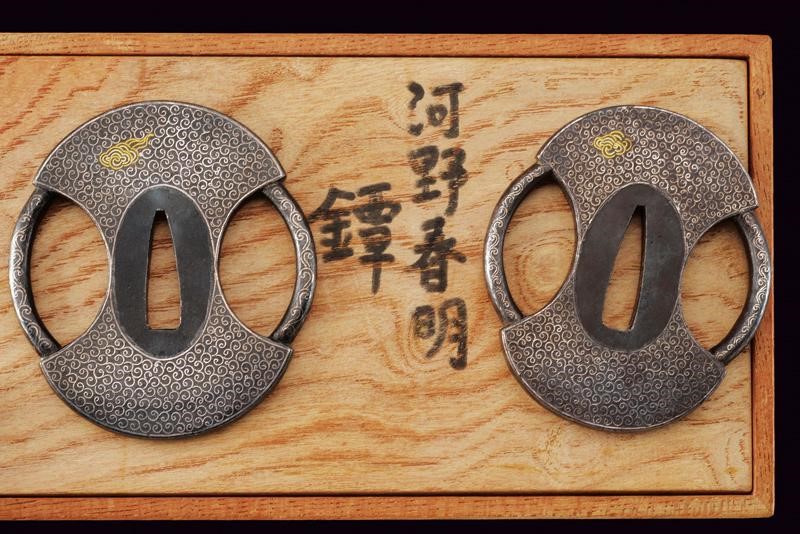 In ferro, di forma mokko e con trafori ryu-hitsu, la superficie decorata con trama a piccoli riccioli rimessi in argento e altri decori circolari ageminati in oro. In antico kiri box in legno di magnolia, sul coperchio "Autenticato da Kono Komei".