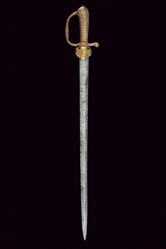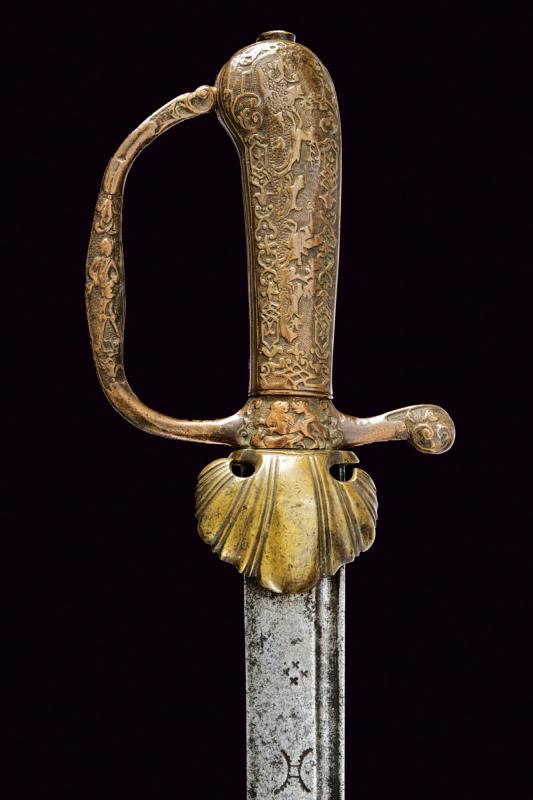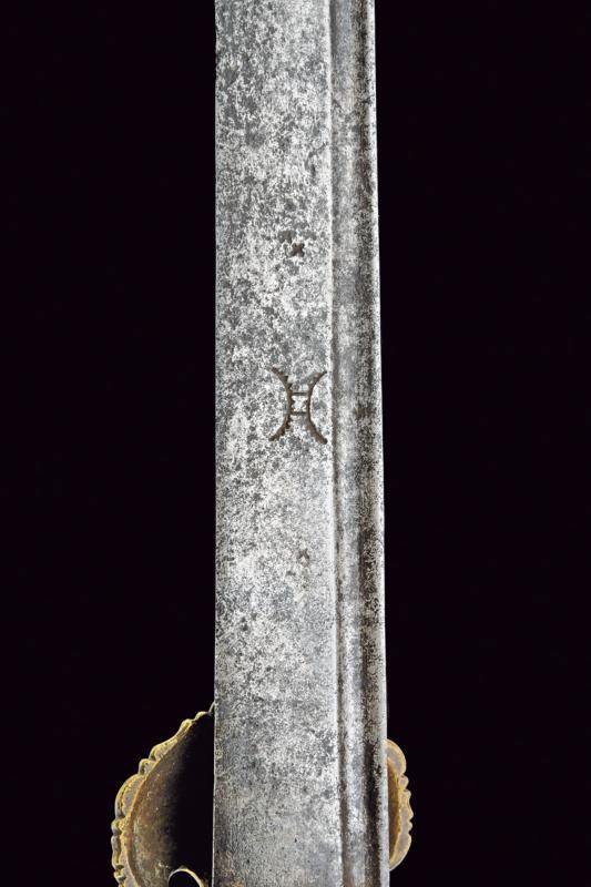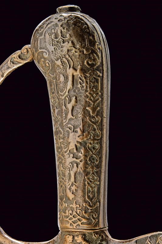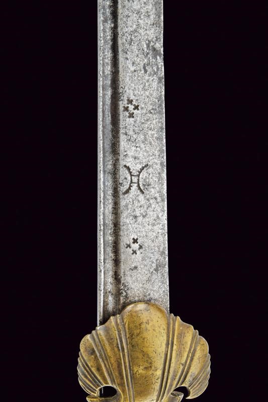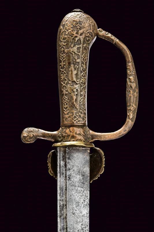 Lama probabilmente ungherese del tardo XVII secolo, con scanalatura accanto al dorso, recante incisioni a semicerchi dentati e crocette al forte. Fornimento del XVIII secolo, la pelta in metallo color ottone. Elso e impugnatura in metallo color bronzo. Al massello effige di cani in lotta con un leone, in bassorilievo, ed altri animali sul retro. Sulla guardia personaggi in rilievo e sull'impugnatura scene di caccia al cinghiale e al cervo, sempre in bassorilievo. Privo di fodero.