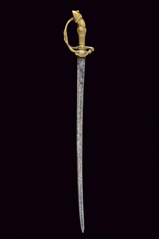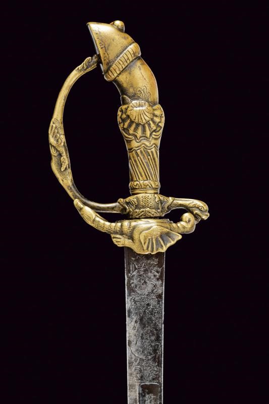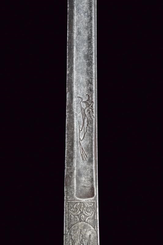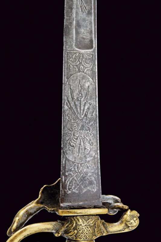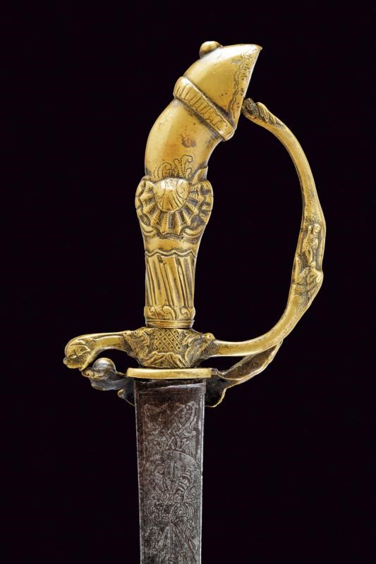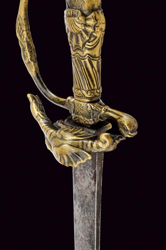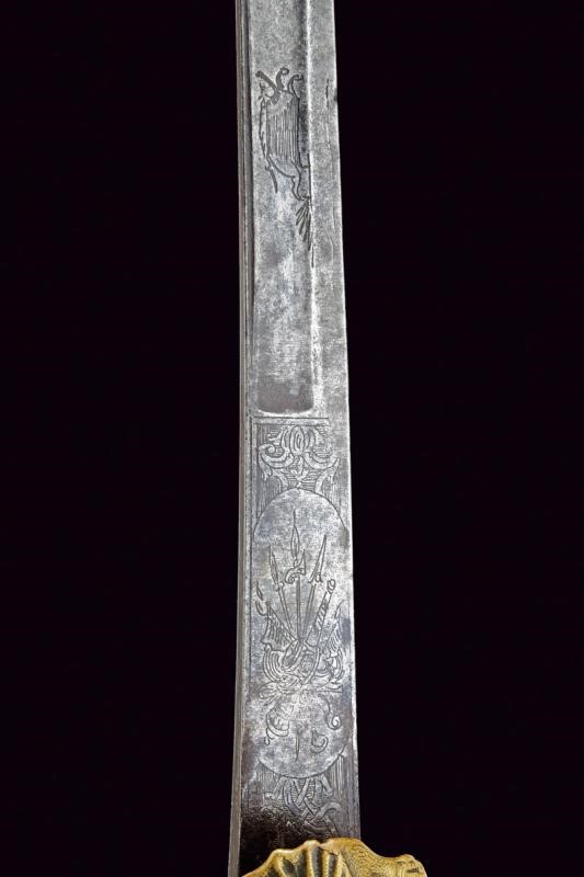 Lama leggermente curva a un filo e controfilo con ampio sguscio centrale, la prima parte piatta incisa a trofei, con un cervo e un cinghiale. Fornimento in ottone massiccio, la pelta con effige di un drago, animali simili sul massello, braccio del elso e ramo di guardia, il pomo a zoccolo di cervo, l'impugnatura a rocaille.