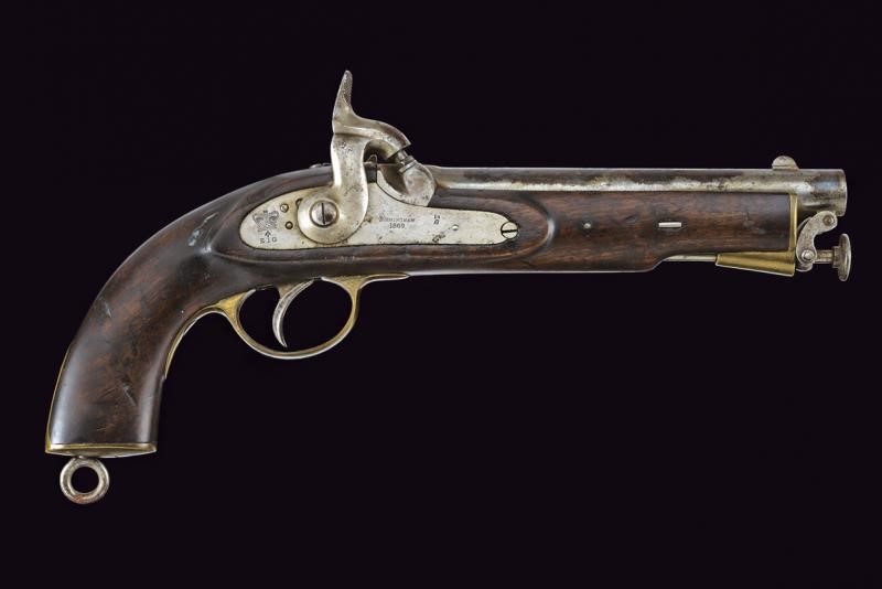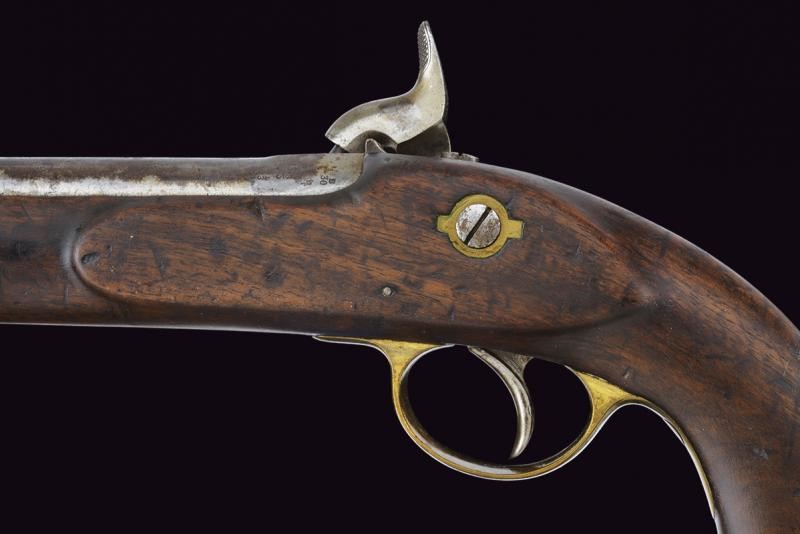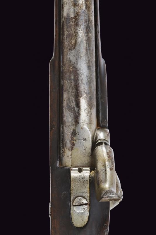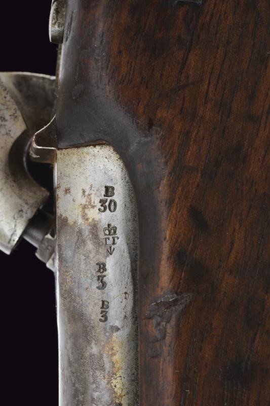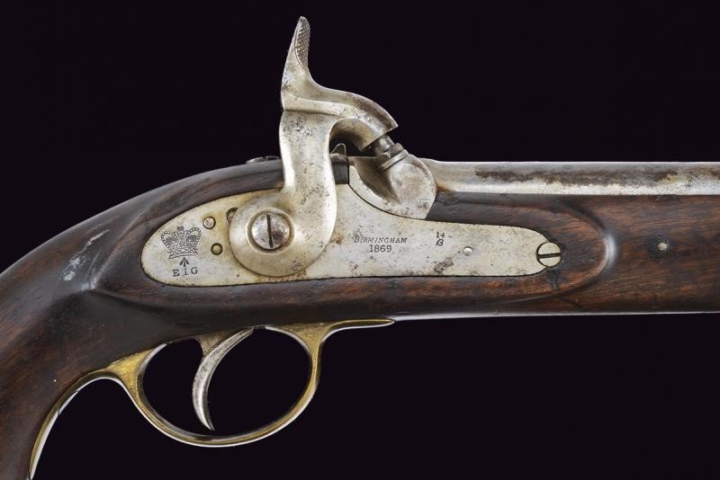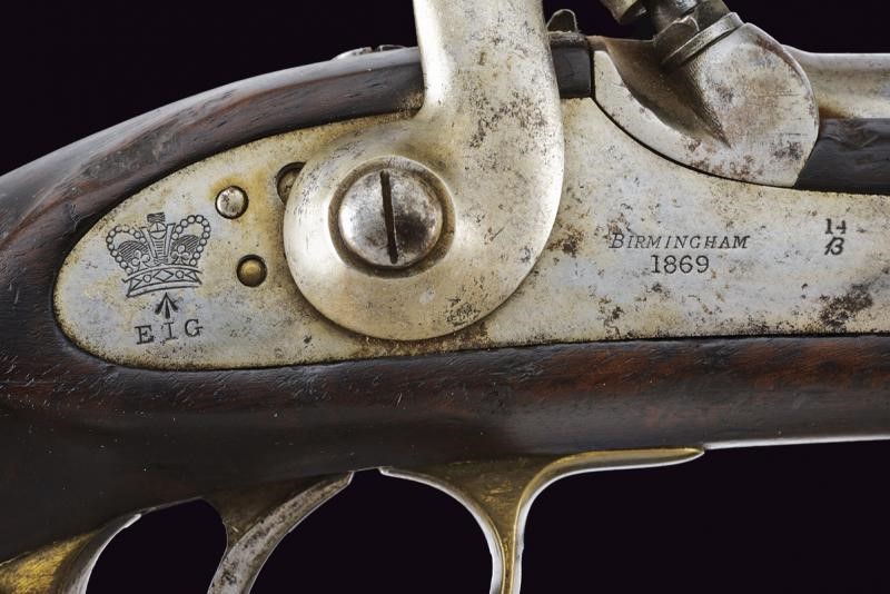 Canna tonda liscia (un po' di pitting all'interno e sulla superficie esterna), con breve bindella alla base e punzoni inglesi militari, dotata di mirino, cal. 16,5 mm in volata. Codolo dotato di alzo fisso. Batteria a molla in avanti, marcata "BIRMINGHAM 1869", "14B", "EIG" sotto corona e con un punzone militare "Broad Arrow". Cassa intera in legno con segni d'uso e del tempo. Fornimenti in ottone e bacchetta a snodo in ferro. Anello porta correggiolo. Meccanica ben funzionante.