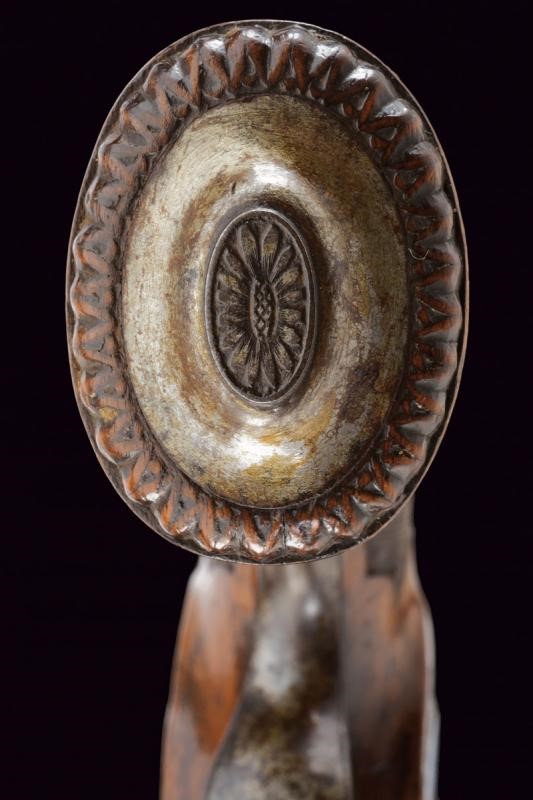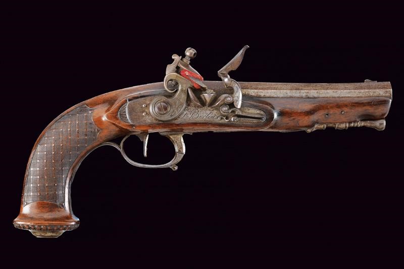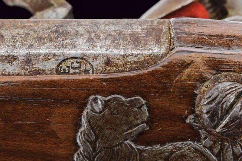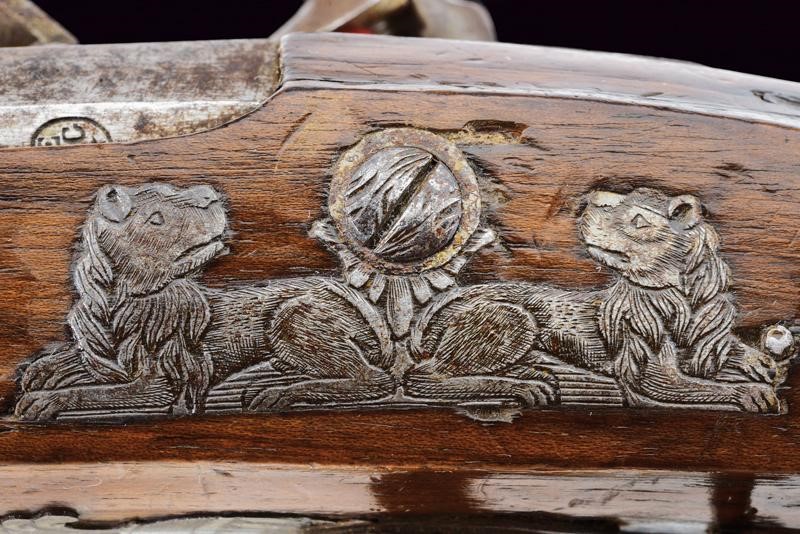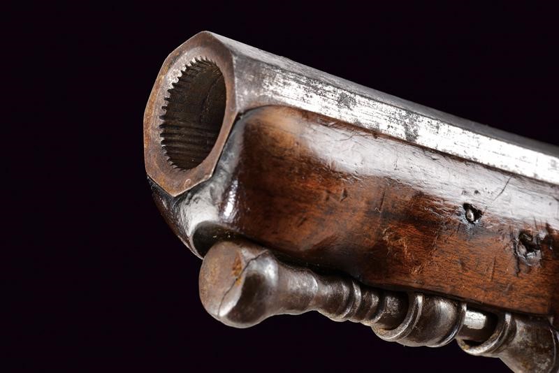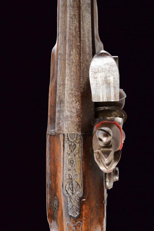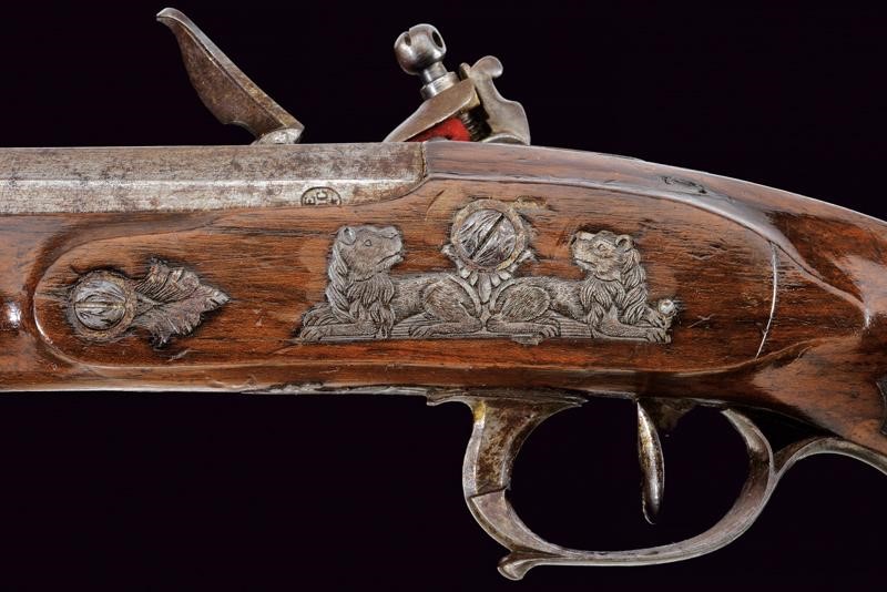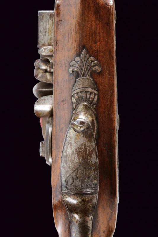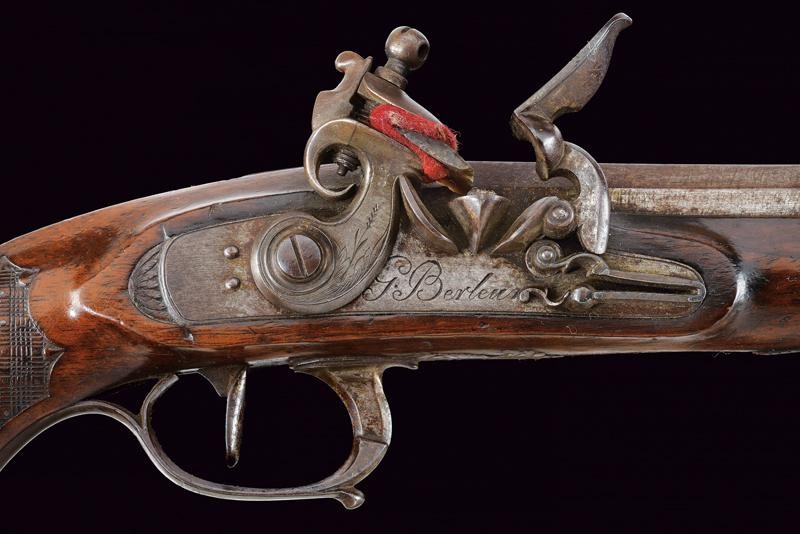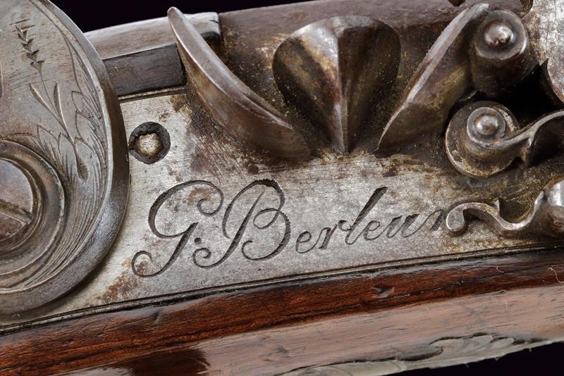 Canna ottagonale, micro-rigata (anima pulita, rigatura ben visibile), recante sul lato sinistro il punzone del banco di prova di Liegi, dotata di mirino, cal. 14 mm; codetta finemente incisa a motivi floreali. Batteria firmata "G. Berleur", munita di sistema antifrizione e a tenuta stagna, la coda incisa. Cassa intera in legno con calcio zigrinato e decorato a chiodini, il dorso con decorazioni in filigrana. Fornimenti in ferro, contropiastra con due leoni sdraiati, il ponticello con lupo e la coccia con fiore. Bacchetta in ferro.