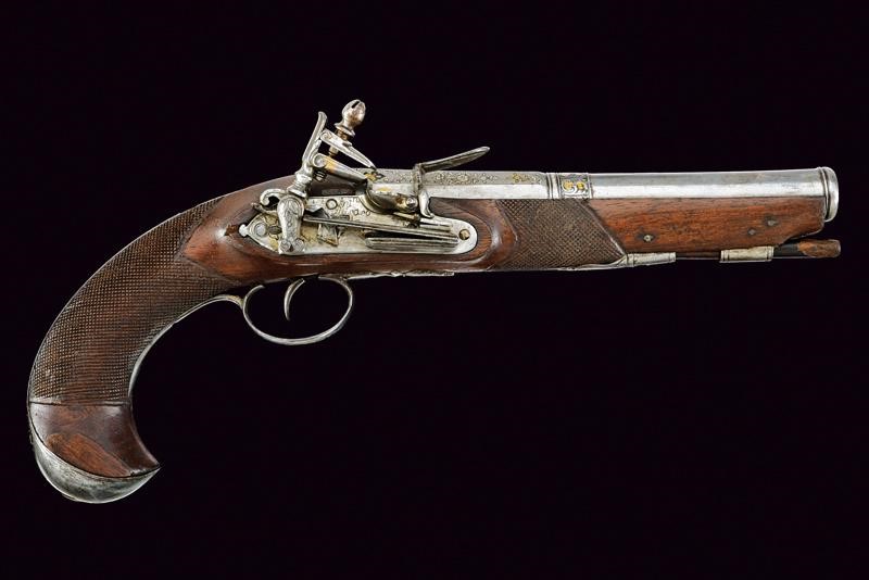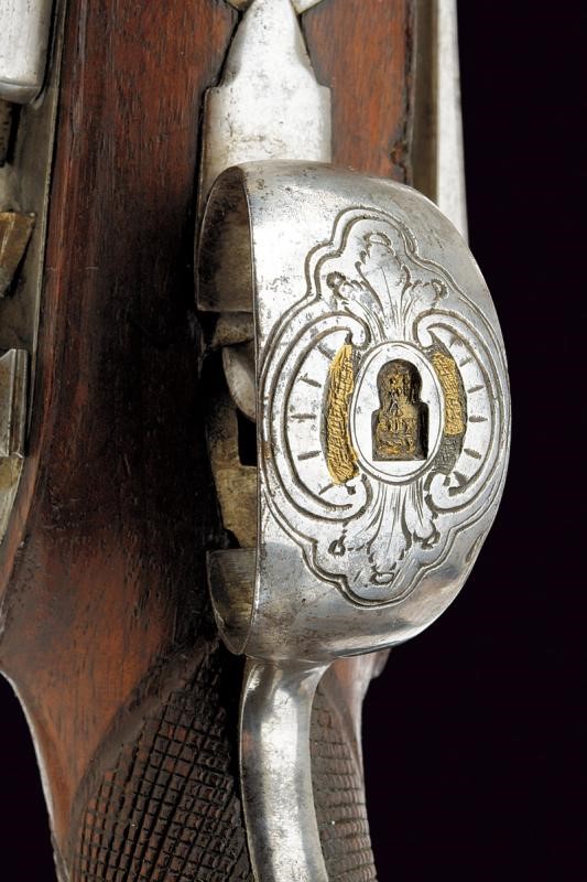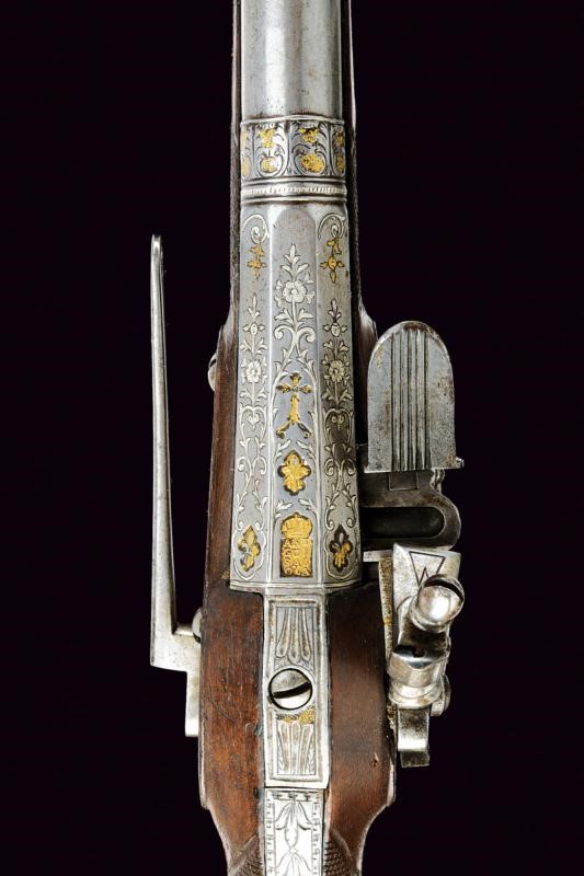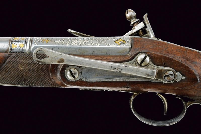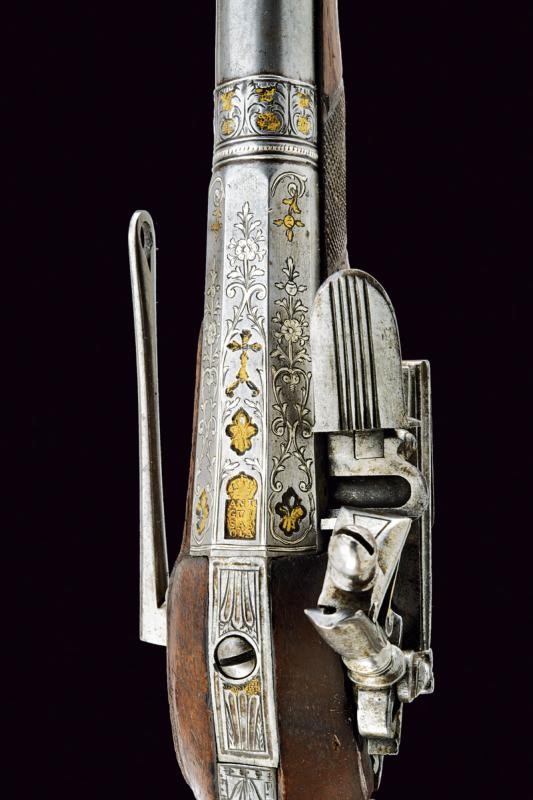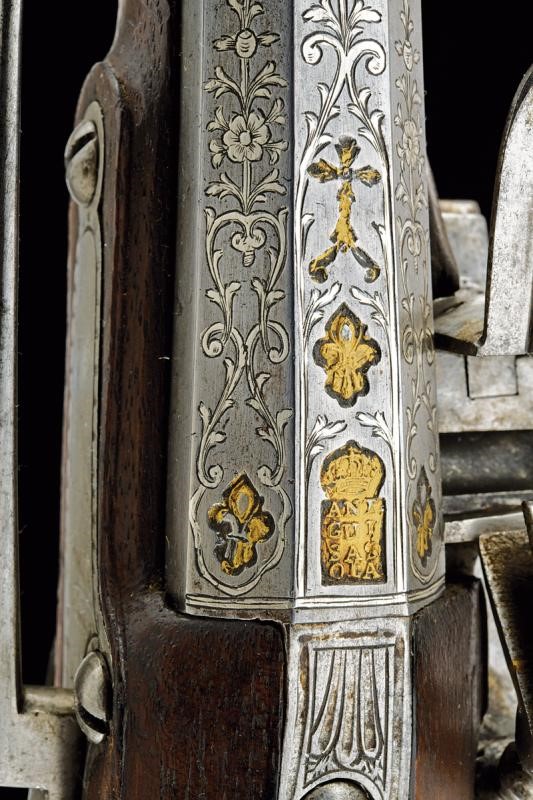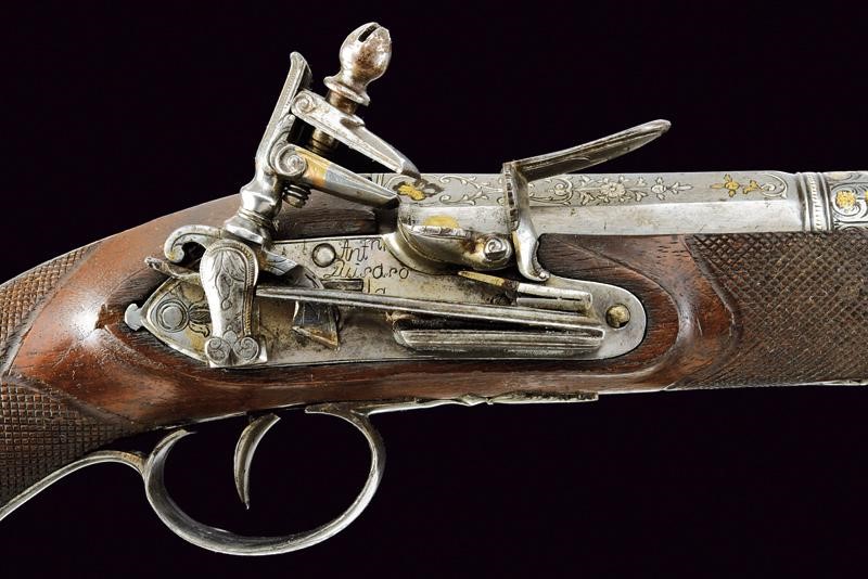 Bella canna a due ordini, ottagonale e tonda, ornata nel primo segmento con incisioni floreali ageminate in argento e con il punzone dorato "ANT/GUI/SAS/OLA" sormontato da corona, posto fra gigli dorati e il tutto sotto ad una croce. anche questa con resti di doratura. Al cambio cornicetta parzialmente dorata e anellatura argentata. Il secondo segmento di sezione tonda, con gioia di bocca. Cal. 17 mm. Il codolo della canna inciso a palmette. Batteria alla micheletta firmata "Ant.n. Guisaso / la" (Antonio Guisasola). Con meccanica funzionante. Forse una vecchia riparazione alla ganascia inferiore del cane. Cassa intera in legno coon un paio di riparazioni sul fondo dell'impugnatura. Segmenti zigrinati al collo e all'astina. Fornimenti in ferro parzialmente ornati con incisioni floreali. Sul ponticello punzone con resti di doratura posto fra rocaille. Gancio da cintura alla contropiastra. Semplice bacchetta in legno.