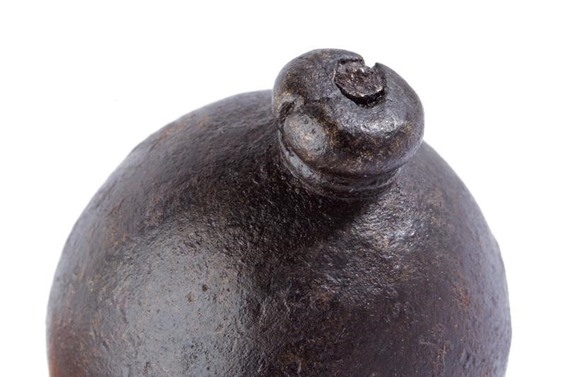 In ferro, di forma tonda allungata, completo di basetta e bottone; attraversato da una chiave antica per l'utilizzo come peso.
