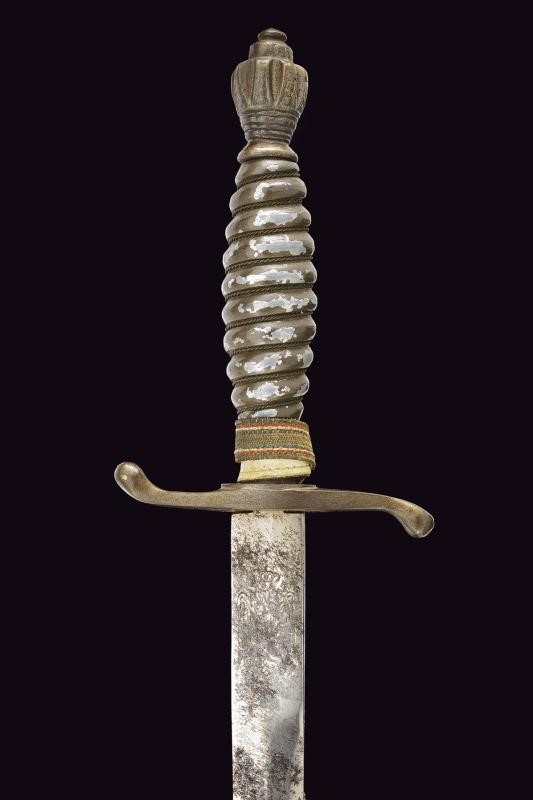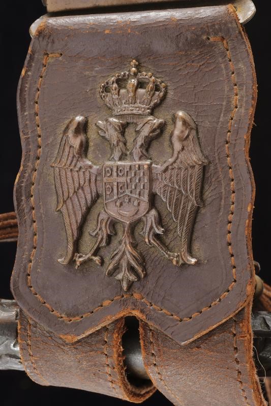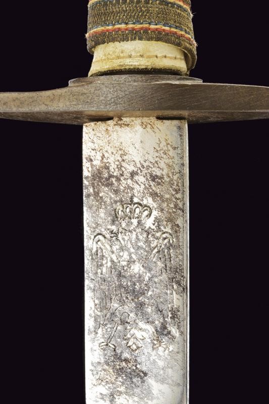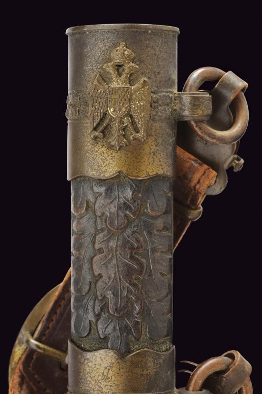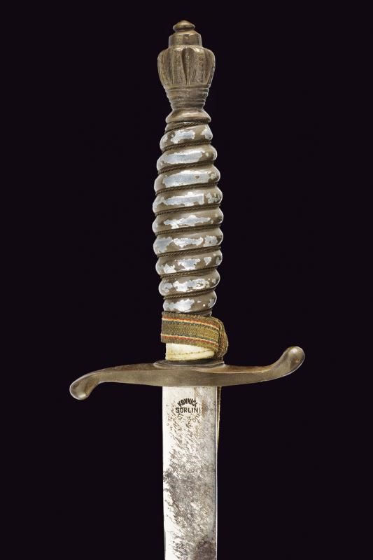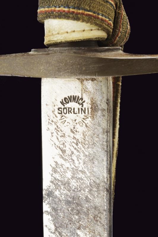 Lama a due fili (qualche ossidazione) con aquila bicipite coronata al tallone e marcatura "KOVICK SORLINI ..." (il resto non leggibile). Elso, impugnatura e pomo in metallo non ferroso, con resti di finitura bronzata. Dragona in tessuto color argento. Fodero ornato a fronde di quercia in rilievo. Con cappa recante emblema ad aquila bicipite coronata. Due campanelle. Completo di attacchi in cuoio. Segni d'uso e del tempo.