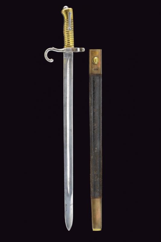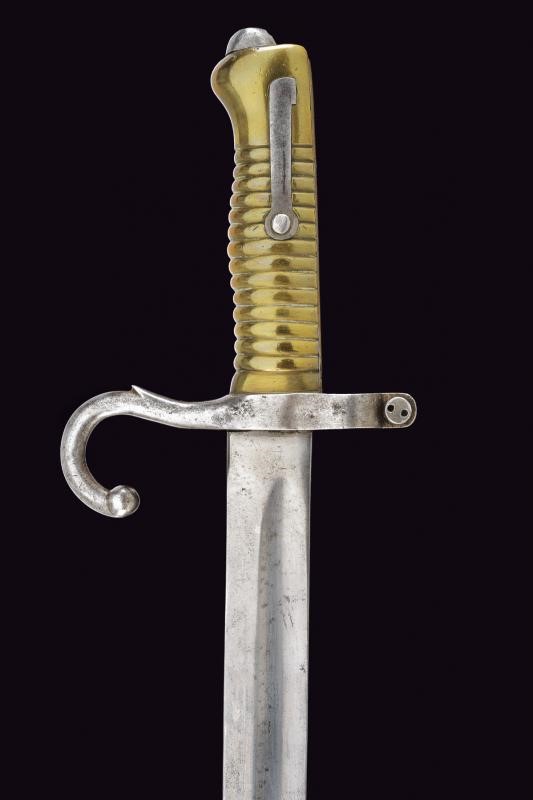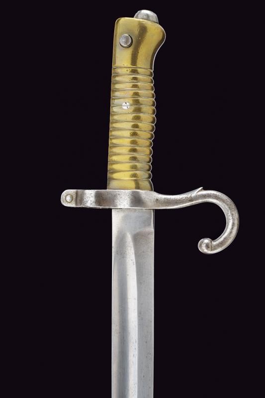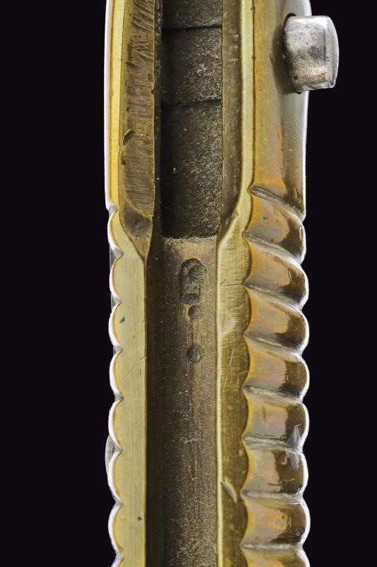 Lama dritta a un filo e breve controfilo, sgusciata. Crociera in ferro con tipico dente, braccio incurvato e anello. Impugnatura in ottone. Pulsante a molla funzionante. Fodero in cuoio (segni d'uso e del tempo) con fornimenti in ottone.