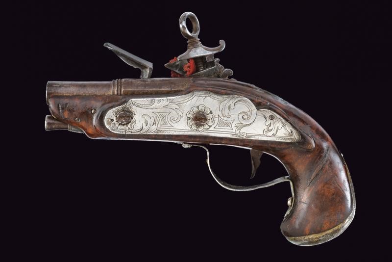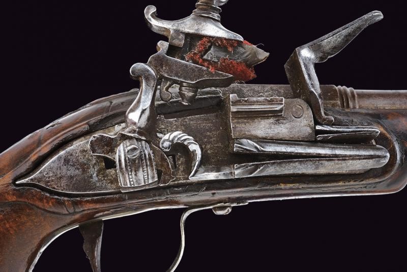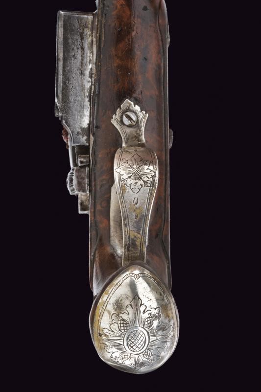 Canna liscia a due ordini, prima ottagonale, con anellature al cambio e in seguito tonda; cal 7.1 mm. Batteria alla romana con molle leggermente intagliate. Cassa intera in legno (difetti e piccoli restauri). Fornimenti in argento, incisi a racemi e a motivi floreali. Bacchetta in ferro munita di cavastracci.