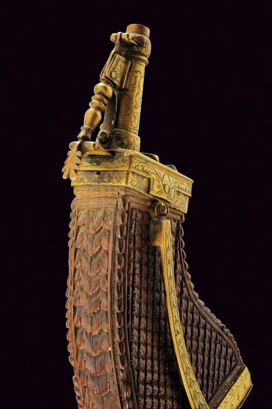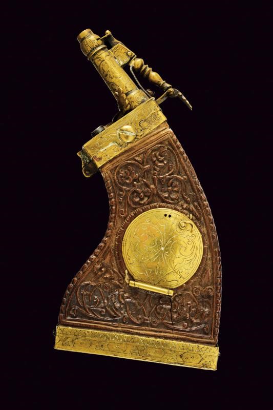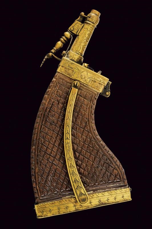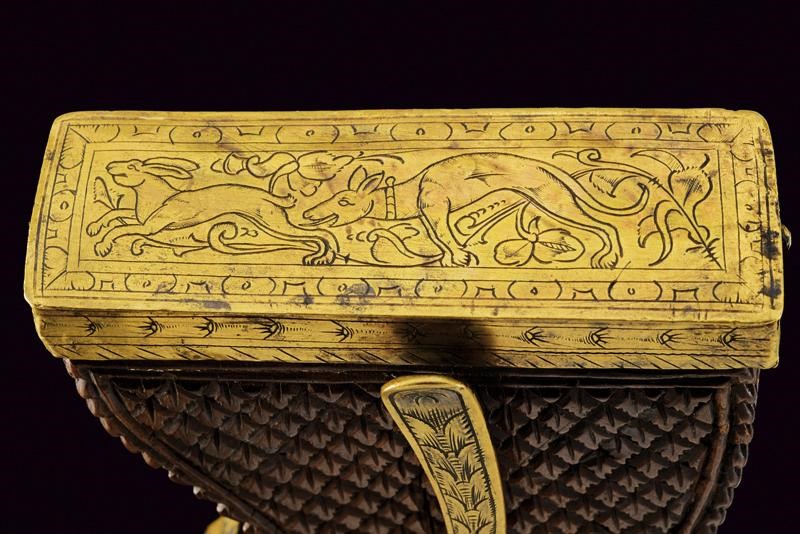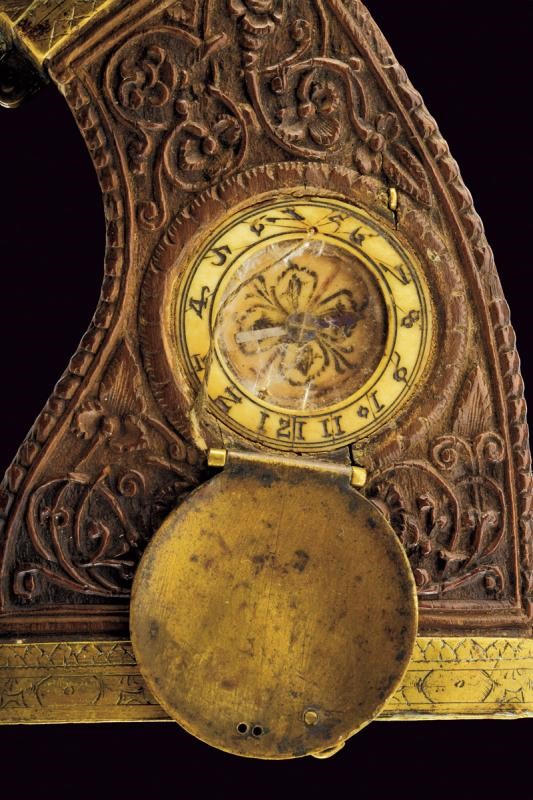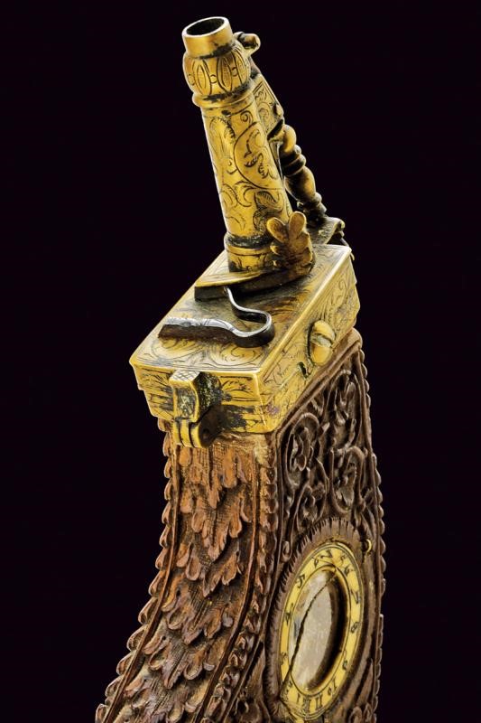 In legno, di forma incurvata, a pianta rettangolare. La faccia anteriore maestosamente scolpita con volute in bassorilievo e dotata al centro di una bussola in osso, questa dotata di ghiera numerata da uno a dodici e munita di coperchio in ottone circolare incardinato e con gancetto di chiusura; il legno attorno alla bussola intagliato a formare una cornice a fronde di quercia. Il retro con intaglio a trama di rombi. Fornimenti in ottone inciso. La base con effige di un segugio che insegue una lepre, attorniati da volute e fiorami. Bel cannello in ottone inciso, dotato di molla in ferro decorata con piccoli intagli. Gancio da cintura decorato en suite.