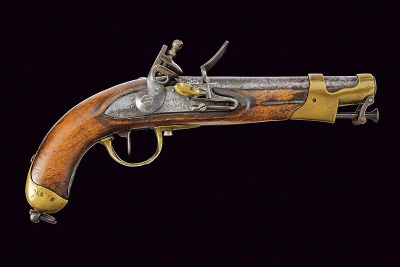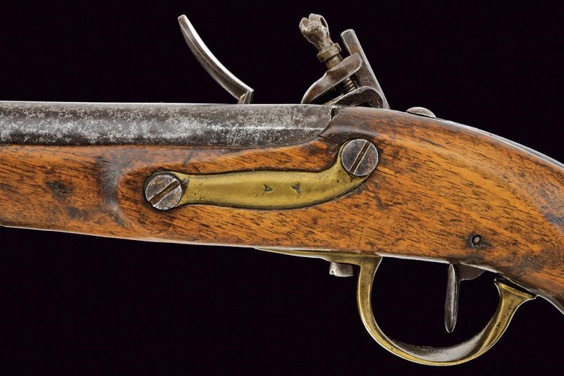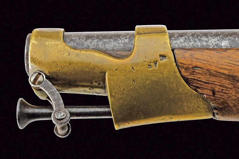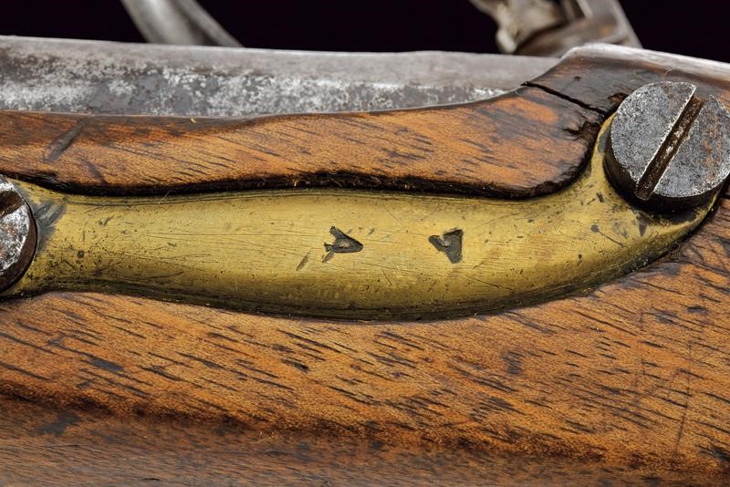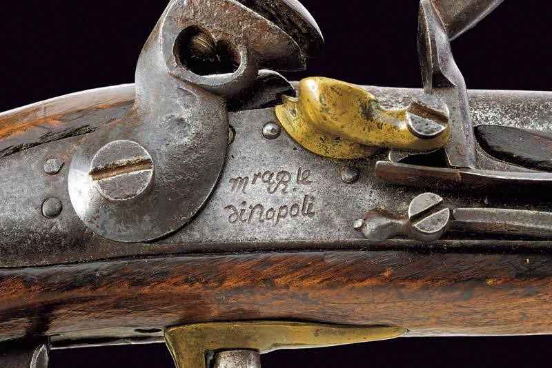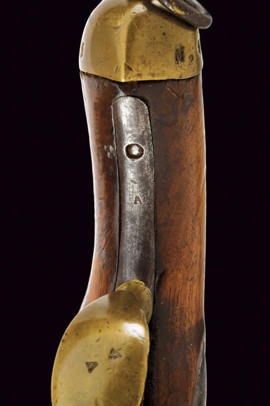 Canna tonda liscia, con culatta ottagonale recante resti di marcature; ossidazioni generali e piccoli danni da ruggine; cal. 16.8 mm. Batteria a pietra focaia con cartella marcata "m.ra R.le di Napoli"; scodellino in ottone. Cassa intera in legno (segni d'uso e del tempo). Fornimenti in ottone punzonati "A"; la coccia marcata anche "N. 93". Bacchetta a snodo ed anello di sospensione in ferro.