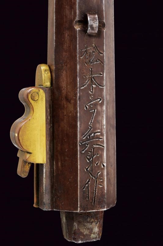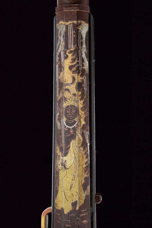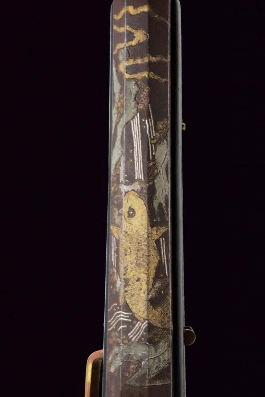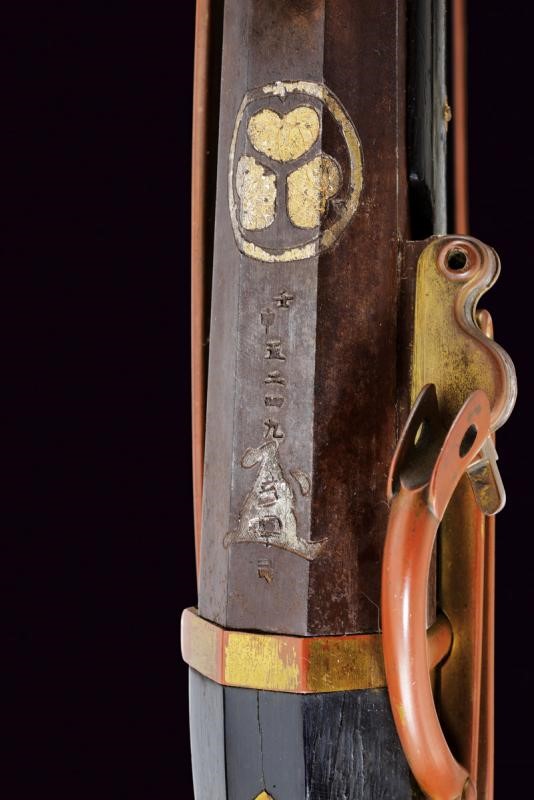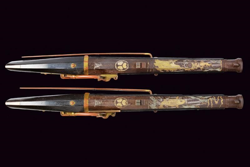 Pesanti canne ottagonali lisce, recanti alla base numerazione in caratteri giapponesi, poi il Mon del clan Tokogawa rimesso in argento con resti di doratura. Una canna ornata inoltre con una bella incisione di una carpa koi che salta in una cascata, la scena rimessa in argento e con elementi dorati. Sull'altra canna una bellissima raffigurazione di Fudo Myo-o, nella tipica raffigurazione con spada (sankoken) in una mano e laccio kensaku nell'altra, e avvolto dalle fiamme (anche in questo caso alcuni elementi sono rimessi in argento e dorati). Le volate con segmento circolare e gioia di bocca, in cal. 13 mm. Tutte e due le canne con alzo e mirino. Nella parte inferiore la firma "Matsumoto Uhyoe Saku". Batterie a miccia con cartella piatta in metallo dorato (mancanze), scodellino in ferro e copriscodellino girevole in ottone (copriscodellini, molle e cani con resti di doratura). Meccaniche funzionanti. Casse di tipica forma in legno scuro; sul lato sinistro gancio da arcione. Bacchette mancanti.