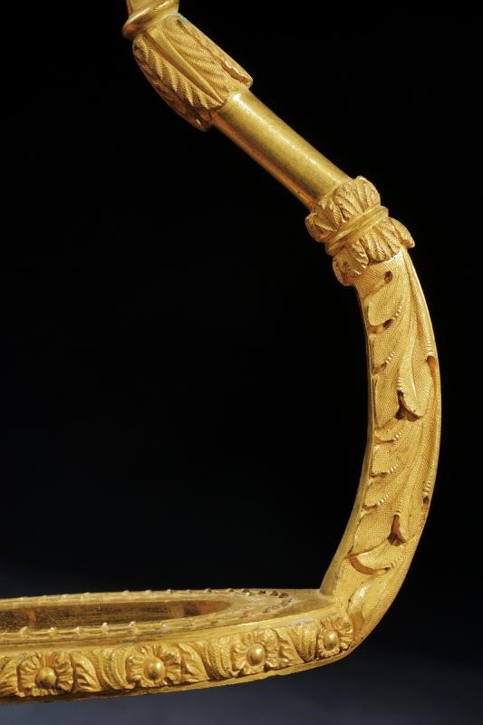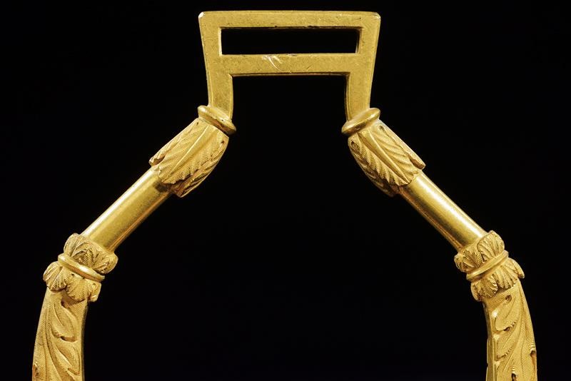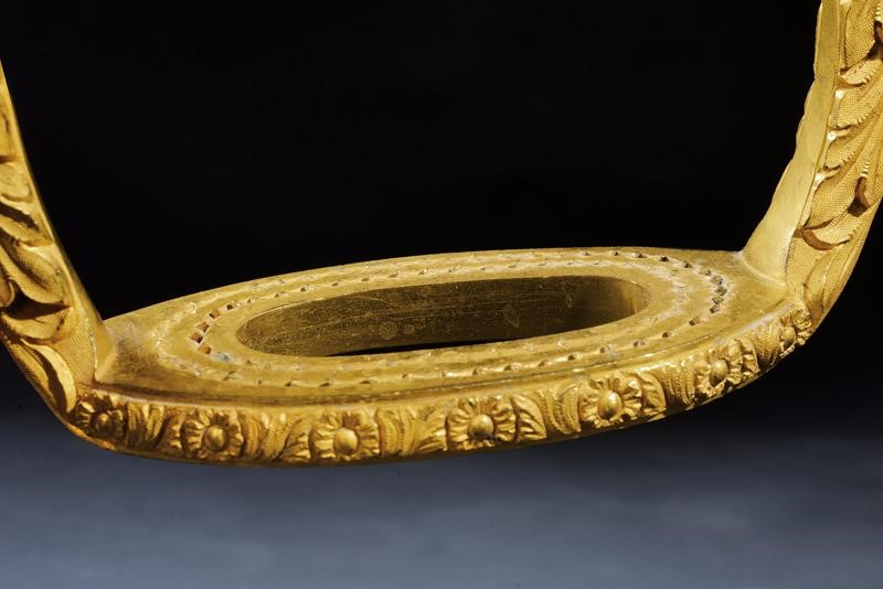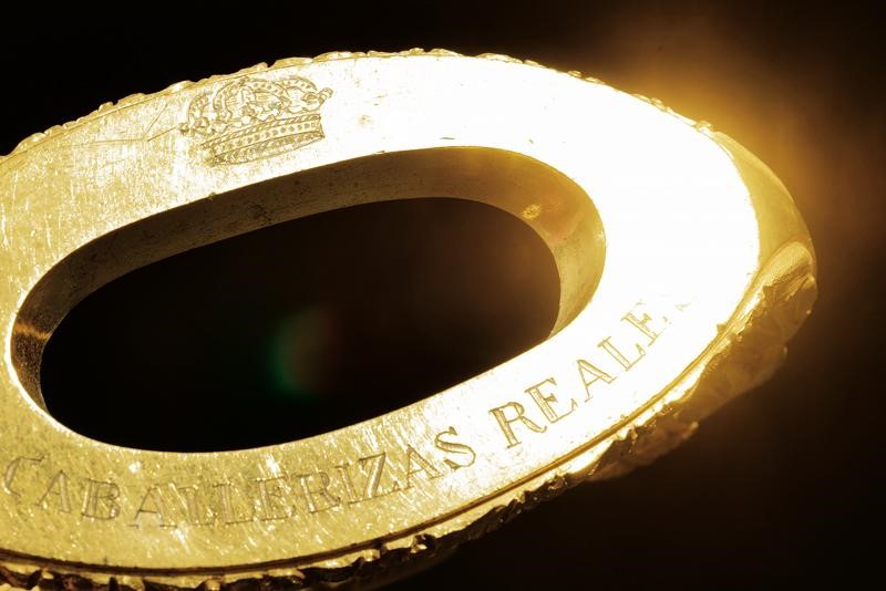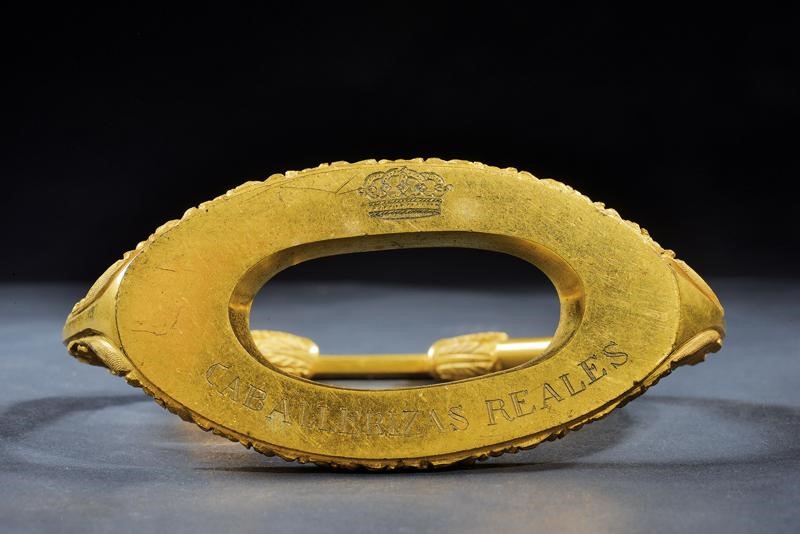 In bronzo dorato a fuoco, bracci curvi decorati a fogliame in bassorilievo. Panche con apertura centrale ovale, bordi incisi a fiori; la superficie della panche ruvida. Marcate in basso "CABALLERIZAS REALES" ed incisa con una corona reale. Occhi rettangolari.