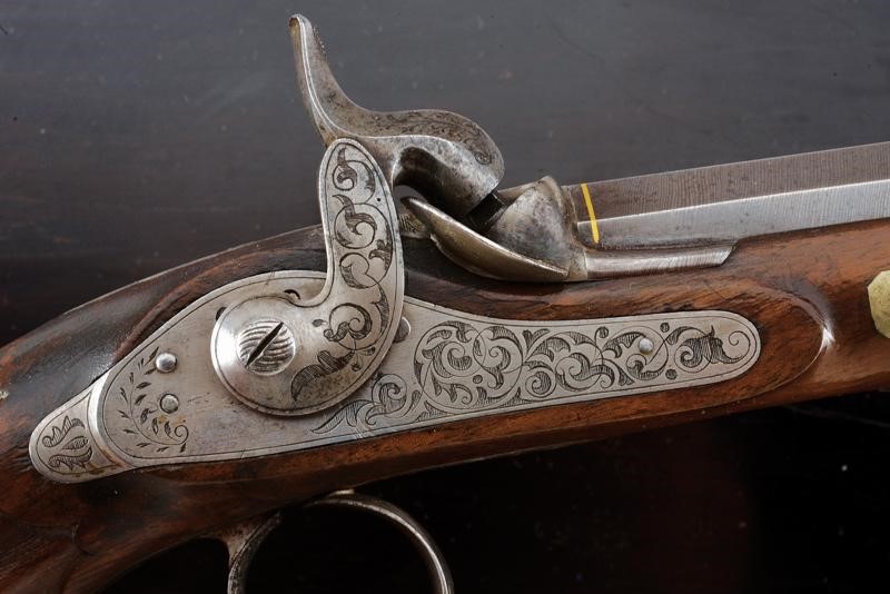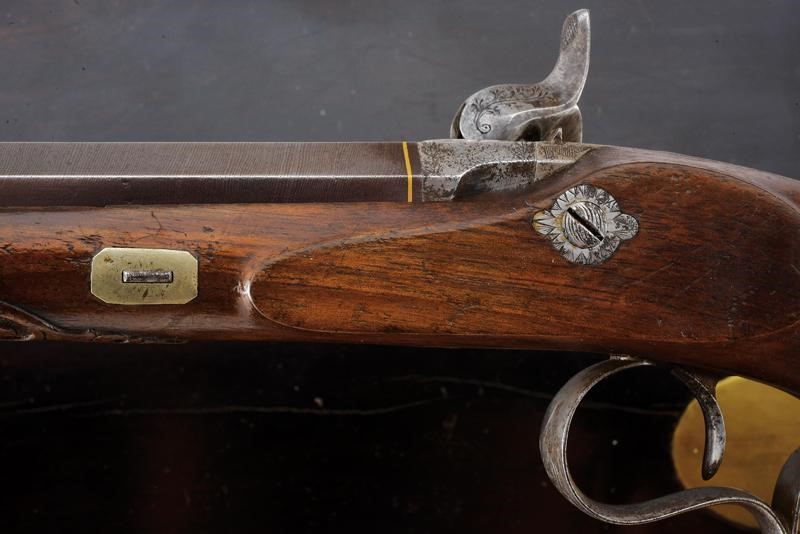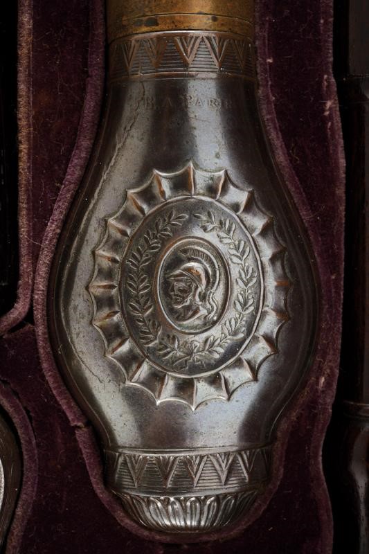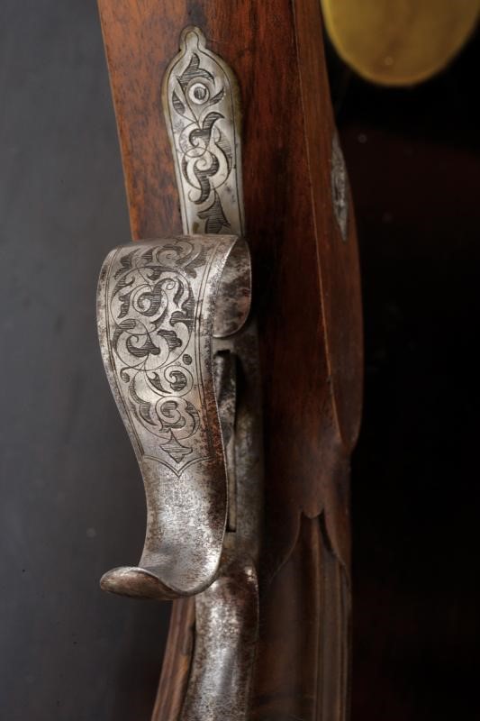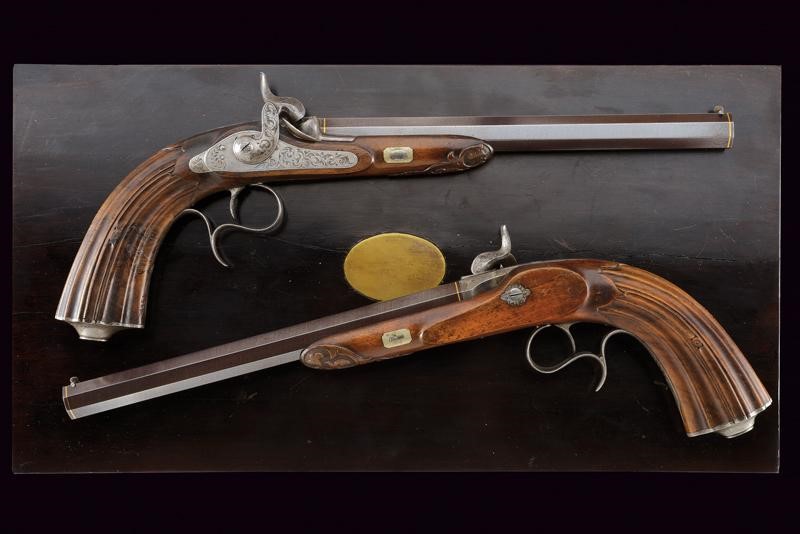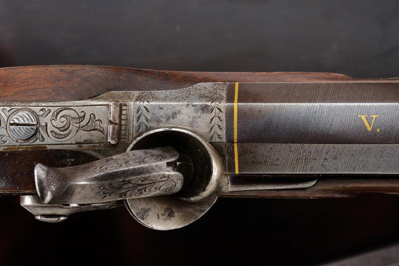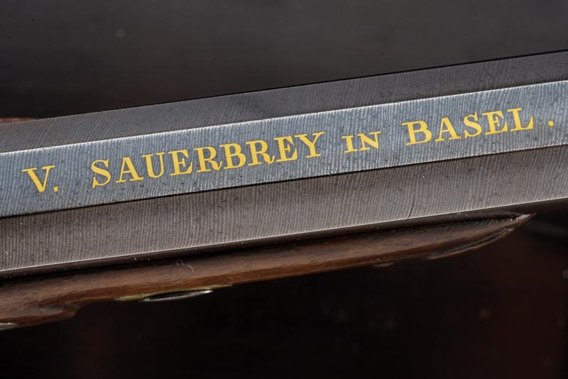 Canne ottagonali rigate (anime pulite, leggero pitting, rigatura ben visibile), in damasco, firmate "V. SAUERBREY IN BASEL" con cornici in oro alle estremità, mirino, cal. 12.5 mm; codette incise a motivi floreali. Batterie a molla in avanti decorate en suite. Casse a tre quarti in legno, scolpite a motivi floreali e con calcio scanalato. Fornimenti in ferro decorati nello stesso modo. Ponticelli con poggiadito. Nella loro cassetta di legno foderata all'interno di velluto bordeaux, completa di tutti gli attrezzi e della chiave.