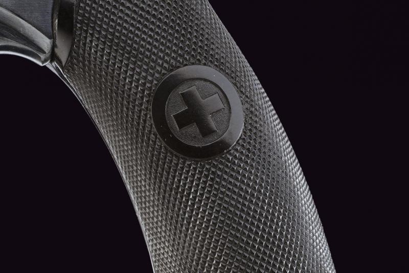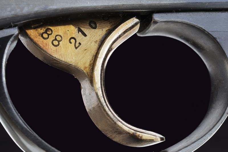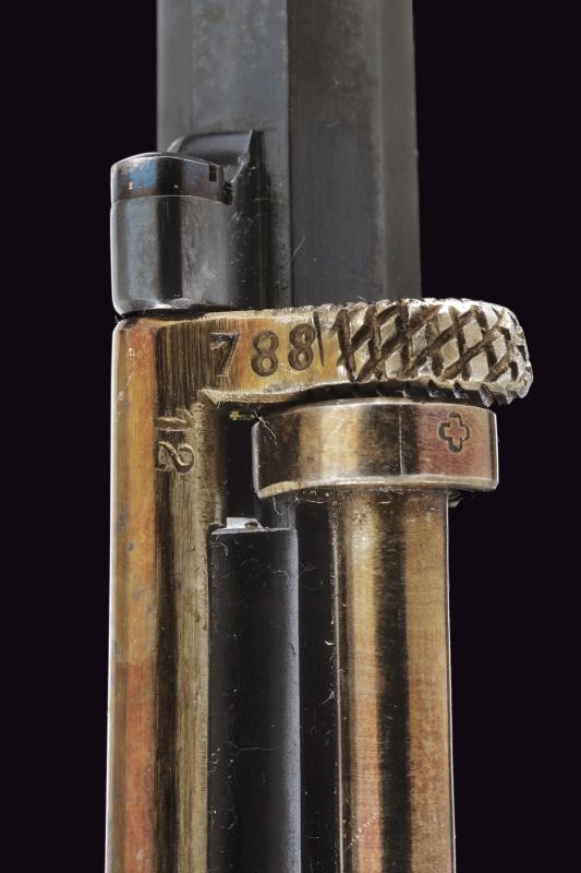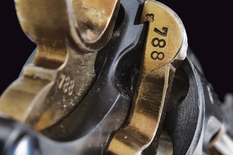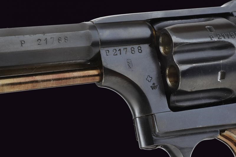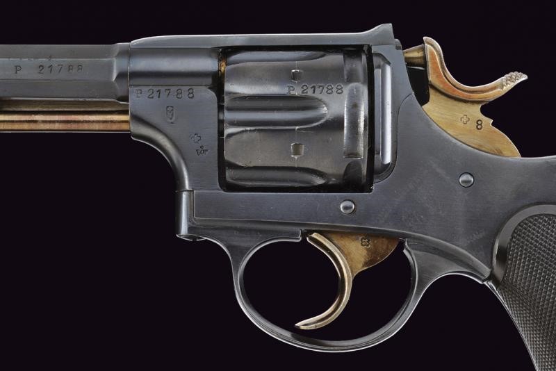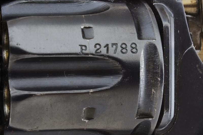 Canna ottagonale rigata, dotata di mirino, cal. 7,5 mm. Tamburo a sei colpi. Punzoni elvetici. Meccanica ben funzionante. Guancette in gommadura zigrinata. Anello porta correggiolo.