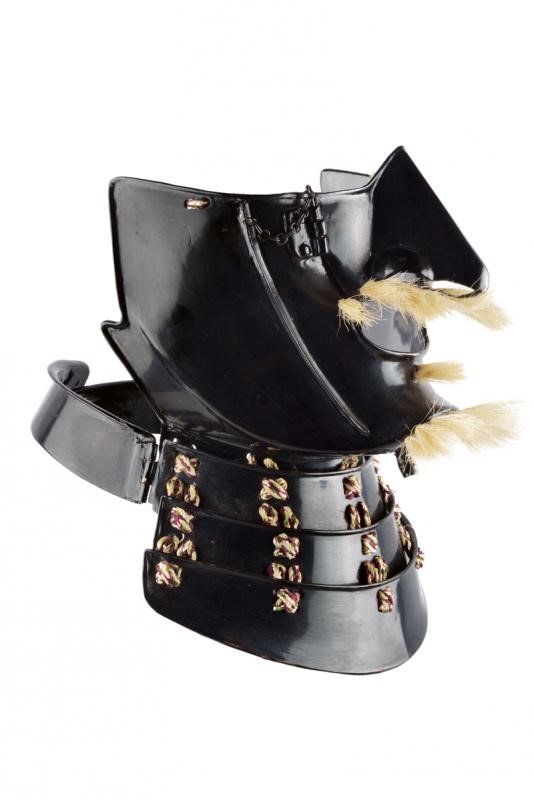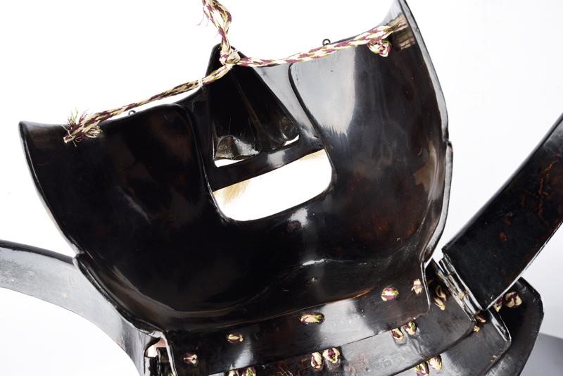 Del tipo Me no shita men. Robusta struttura in ferro espressione nobile. Lacca esterna liscia nera. Naso rimovibile tenuto con fermagli. Bocca aperta senza denti, con mustacchi e pizzo in crine bianco. Interno laccato en suite. Tubo per il sudore. Yodare-kake a tre lame in ferro laccate brune, quasi nere, allacciate sugake in Uname (lacci multicolore). Completo protezione per il collo guruwa in due elementi.