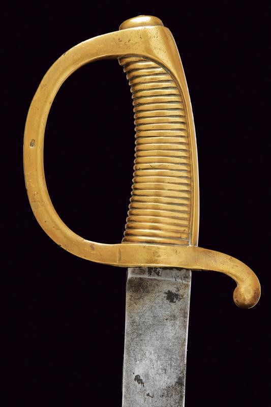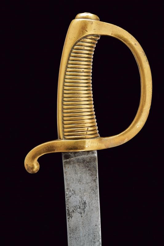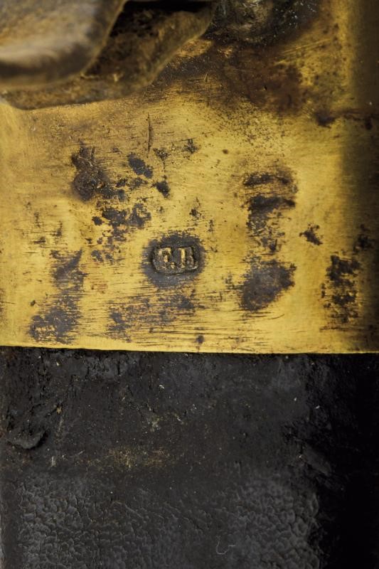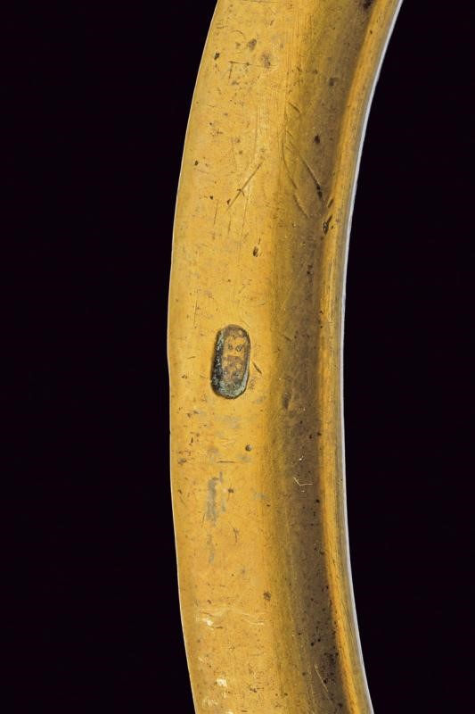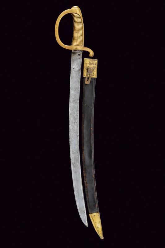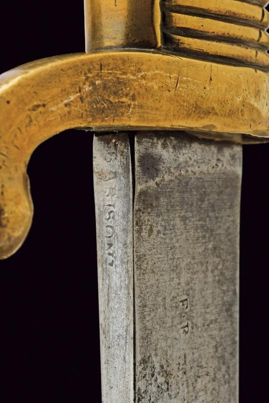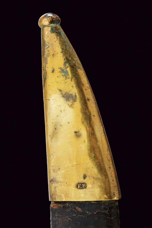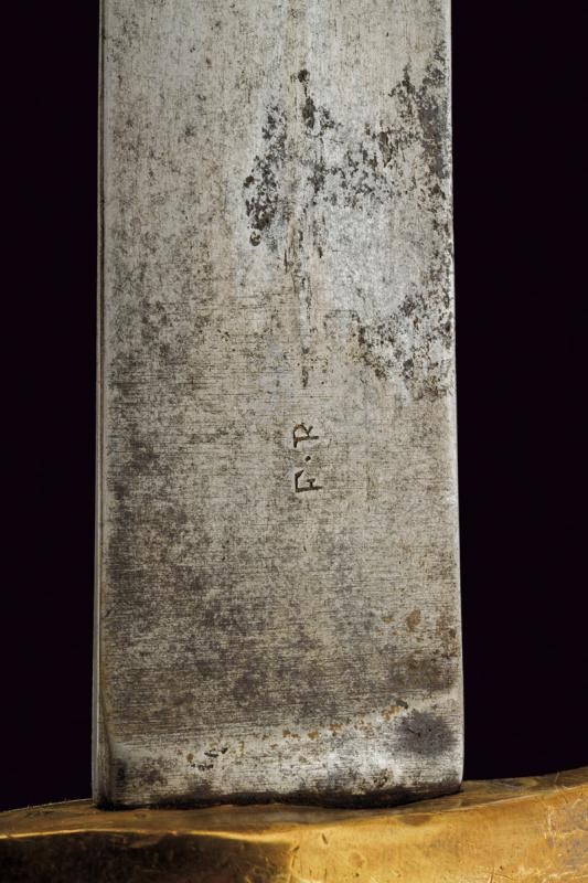 Lama curva a facce piane, marcata al forte "F.R." Il dorso con resti di firma "BARISONI". Fornimento monoelso in un unico pezzo d'ottone, punzonato "M" e "FR". Fodero in cuoio con fornimenti in ottone punzonati "F.B."