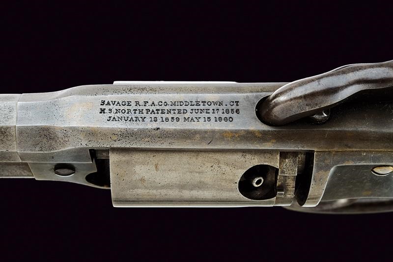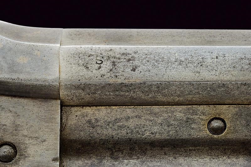 Canna ottagonale rigata (rigatura visibile, anima pulita, leggeri segni di pitting), dotata di mirino in ottone a cuspide, cal. 36. Punzone "S". Tamburo liscio a sei colpi. Meccanica funzionante. Castello marcato nella parte superiore con dicitura della fabbrica e con brevetti del 1856, 1859 e 1860. Impugnatura con guancette lisce in noce con segni d'uso e del tempo, una con ghiera della vite sostituita. Timbro "S" anche sul castello. Qualche lieve traccia di finitura in alcuni punti, alcune intaccature. Matr. "13xxx" all'interno. Grande ponticello munito di grilletto e leva di caricamento ad anello.