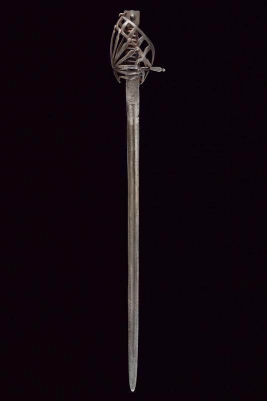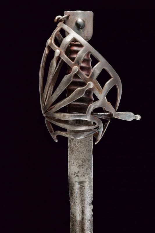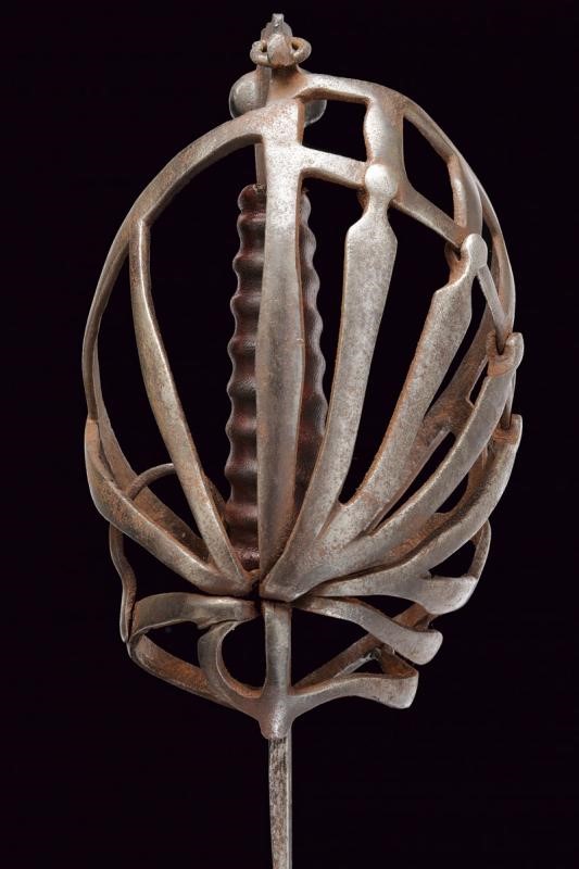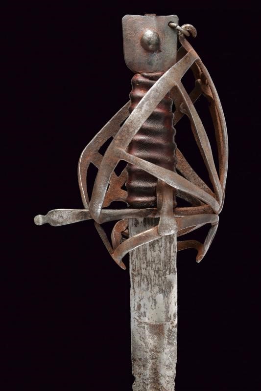 Lama dritta a due fili con sgusciatura centrale; danni da ruggine. Fornimento in ferro di forma tipica a gabbia munito di anello da pollice. Pomo a forma di testa di gatto stilizzata. Impugnatura (di epoca successiva) in cuoio.