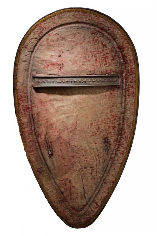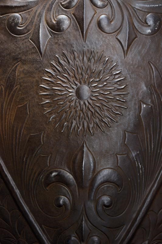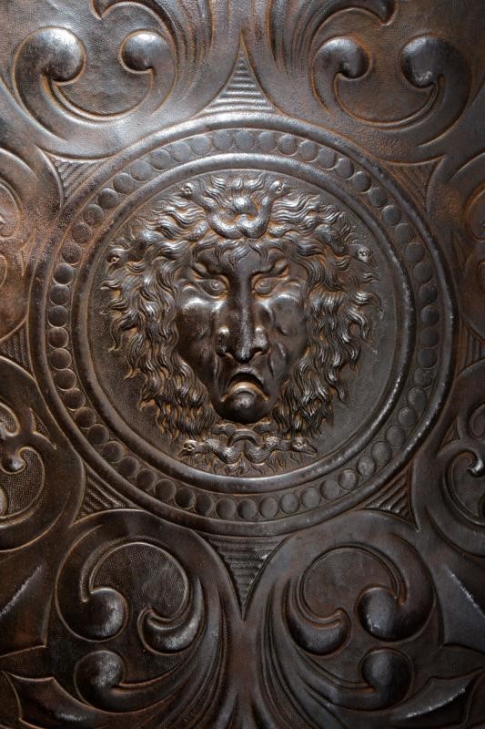 In lamina di ferro, a forma di mandorla; recante al centro un mascherone in bassorilievo con capelli interesecati con serpenti (forse il volto di Medusa), in basso il sole con raggi ed intorno decorazioni floreali, margine ribassato con bordo tondeggiante. Il retro foderato in lino con resti di velluto rosso, il bordo con una banda in canutiglia. Nella parte superiore un fornimento orizzontale in lamina di ferro (attaccato su un solo lato), la controparte inferiore mancante.