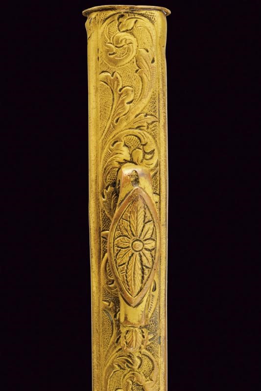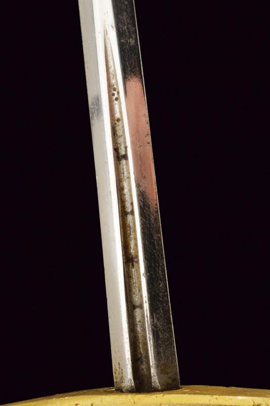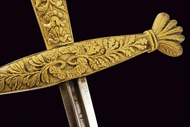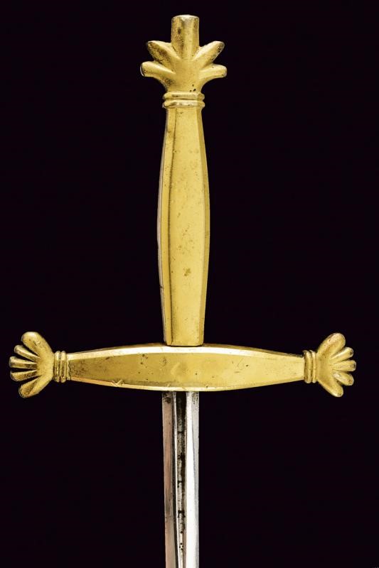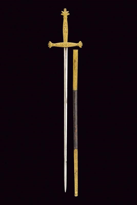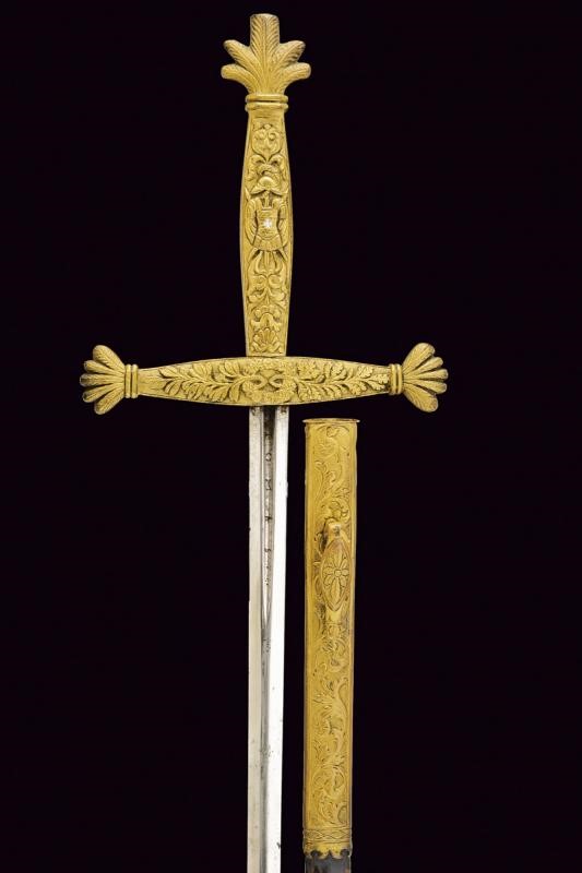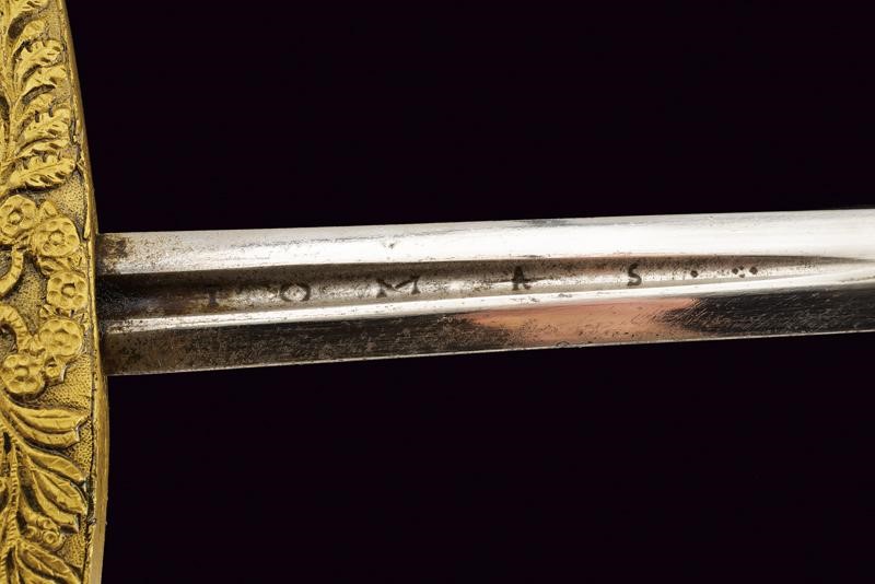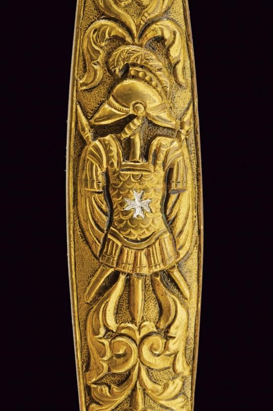 Lama dritta a due fili, scanalata al forte, recante la firma "TOMAS" su un lato e "AIALA" sull'altro. Fornimento in ottone massiccio, dorato, decorato a motivi floreali in bassorilievo; l'impugnatura decorata con un'armatura all'antica caricata sul petto della croce di Malta in smalto bianco. Fodero in cuoio con fornimenti in ottone decorati a motivi floreali in bassorilievo.