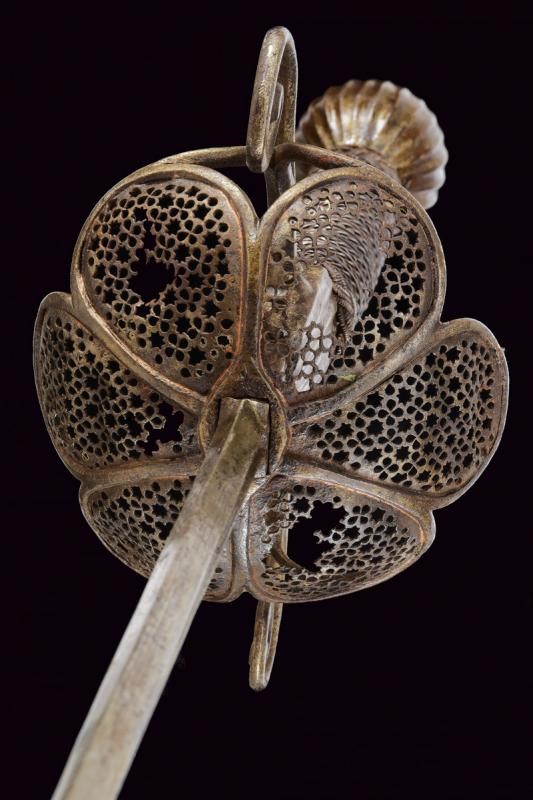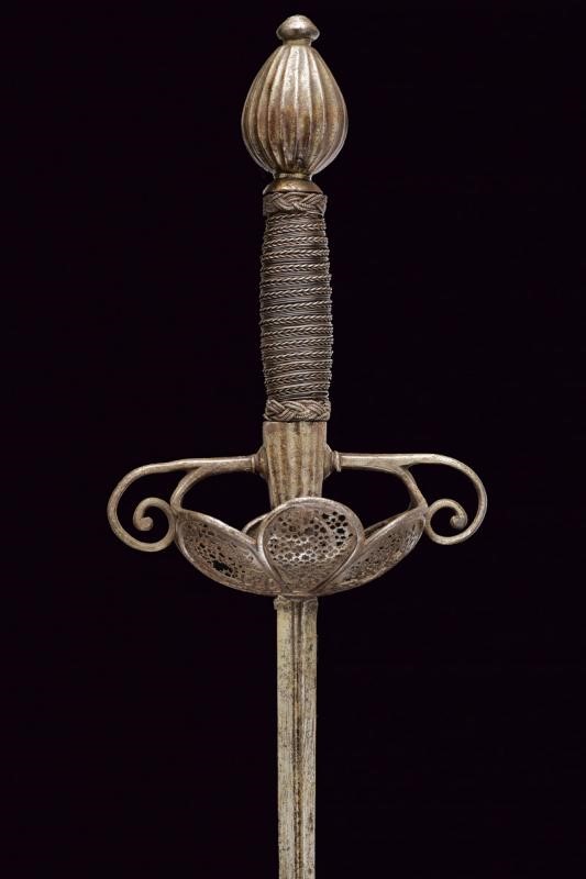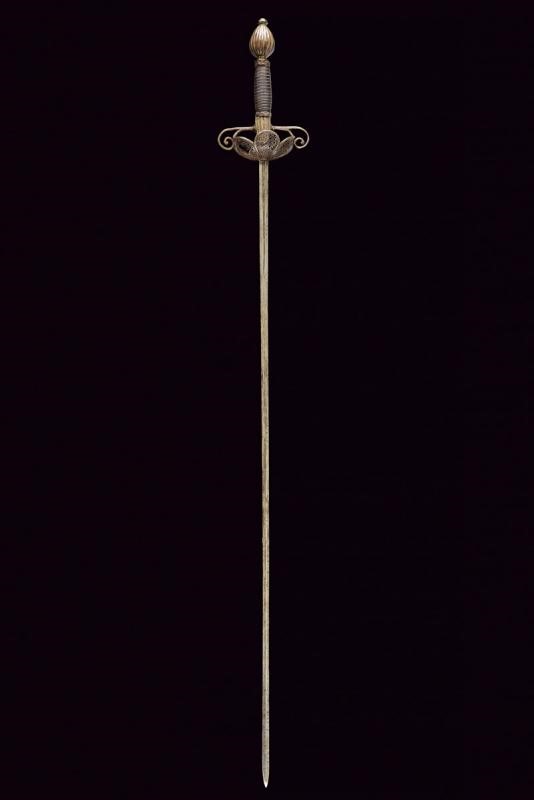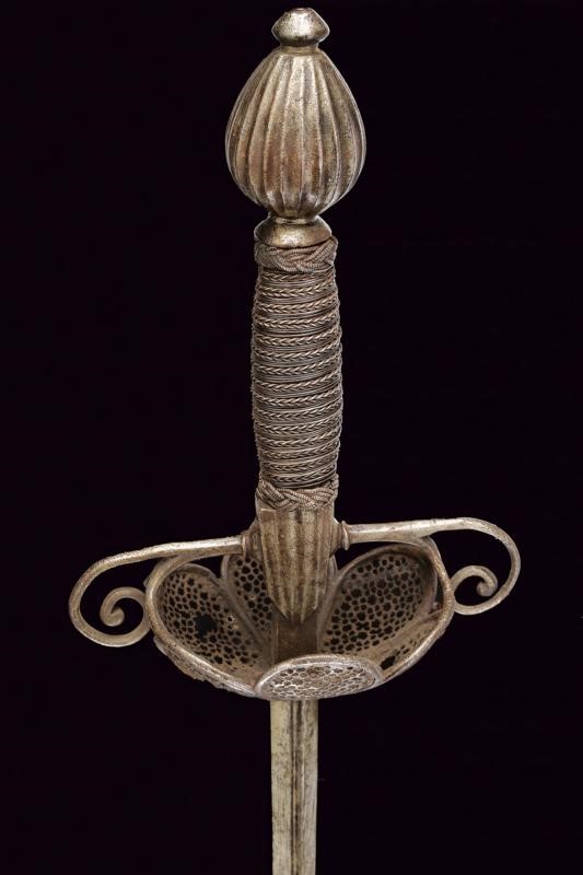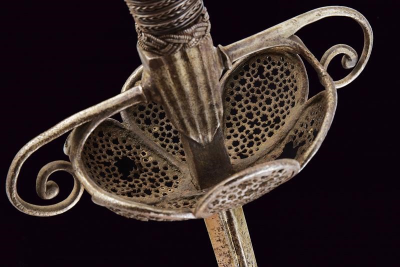 Lunga sottile lama di sezione a losanga, scanalata al forte, con ricasso a parallelepipedo. Fornimento in ferro con coccia a decoro floreale, costituita da sei petali riccamente traforati a stelle e fiori (mancanze); bracci dell'elso incurvati verso la lama e con estremità a riccio; massello appuntito e munito di scanalature, queste sono simili a quelle presenti al pomo, che ha di forma a fico. Impugnatura in legno rivestita con trecciola e dotata di teste di moro in filo di ferro.