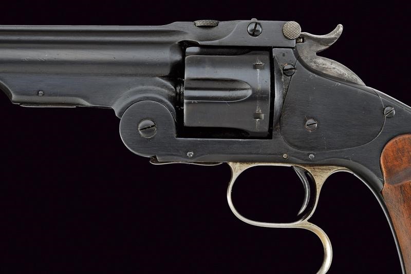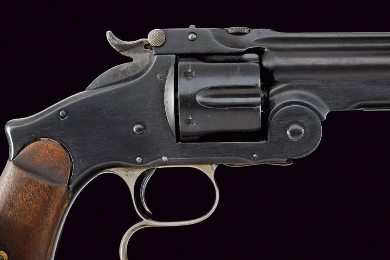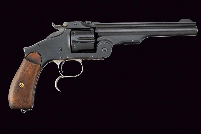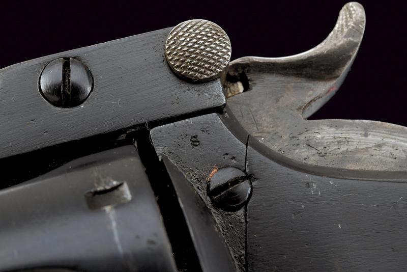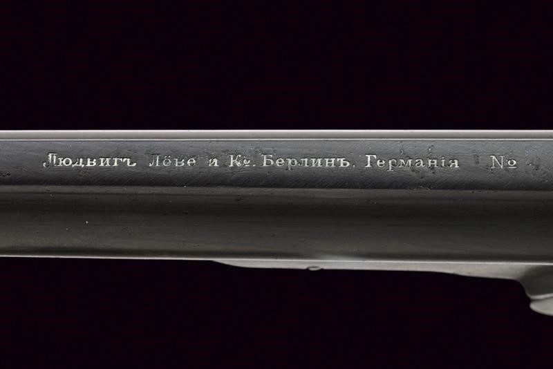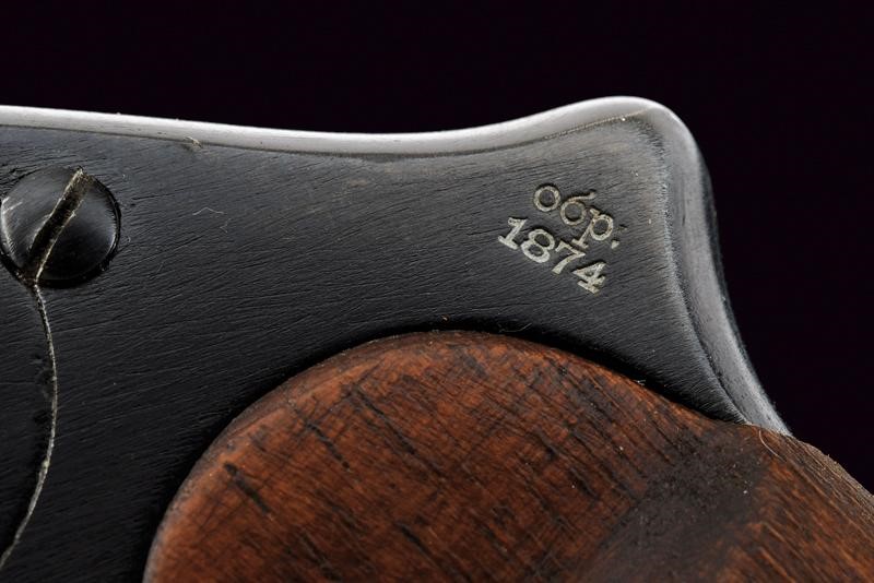 Canna rigata (rigatura visibile, pitting all'interno) da 6-1/2", recante marcatura in cirillico di Ludwig Loewe & Co. di Berlino, i numeri di serie e i punzoni non sono più visibili. Cal. 44 S&W Russian. Sul fianco sinistro del castello marcatura in cirillico del Modello 1874. Forti spazzolature sul metallo e ribrunitura (molti punzoni e marchi non più visibili). Meccanica parzialmente funzionante (primo scatto senza sicura e il tamburo non è bloccato a cane completamente armato). Guancette lisce in legno (più tarde?). Tipico ponticello con poggiadito.