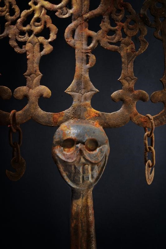 Completamente realizzato in ferro, con tracce di doratura. Con struttura sagomata, traforata e in parte incisa. Tridente rituale tibetano, specificamente una forma di kīla o trishula, usato come stendardo o terminale ornamentale-rituale. Non si tratta di un oggetto rituale comune, ma di un manufatto cerimoniale o simbolico utilizzato in contesti tantrici o sciamanici. Le cinque punte stilizzate a forma di fiamma o di loto rappresentano una variazione del tradizionale tridente a tre punte (trishula), simboleggiando potenti forze esoteriche. L’elemento del teschio alla base è un motivo ricorrente nell’arte rituale del Buddhismo tantrico e del Bön, e rappresenta l’impermanenza e la trasformazione della morte in saggezza. L’estetica complessiva dell’oggetto è coerente con gli oggetti rituali utilizzati nelle pratiche chöd o associati a divinità irate.