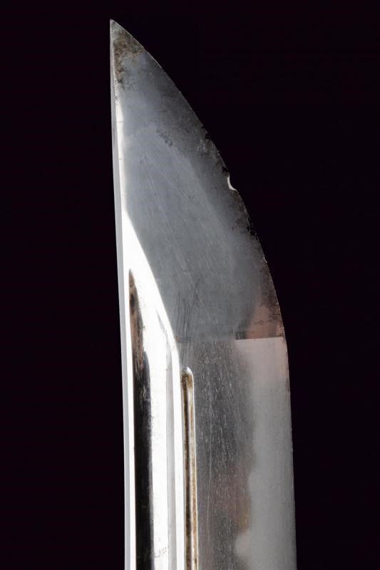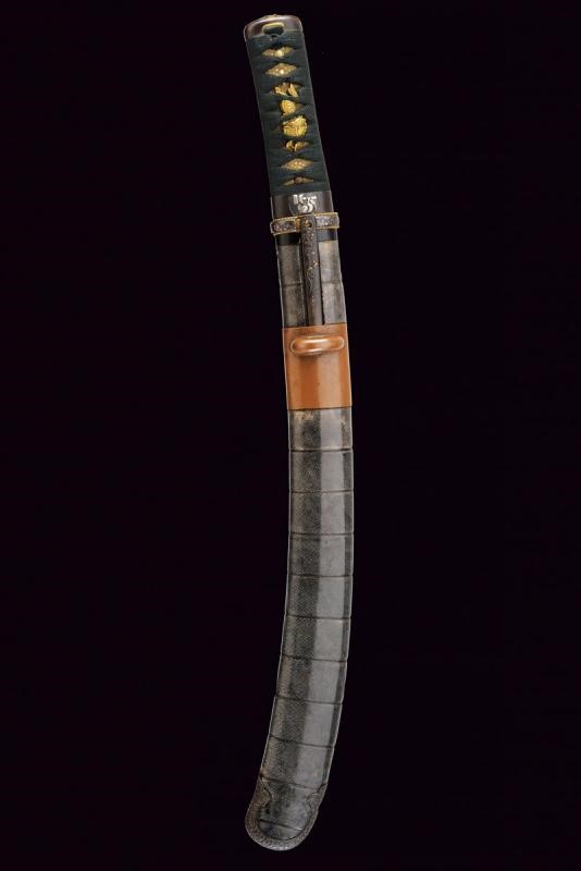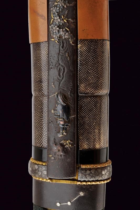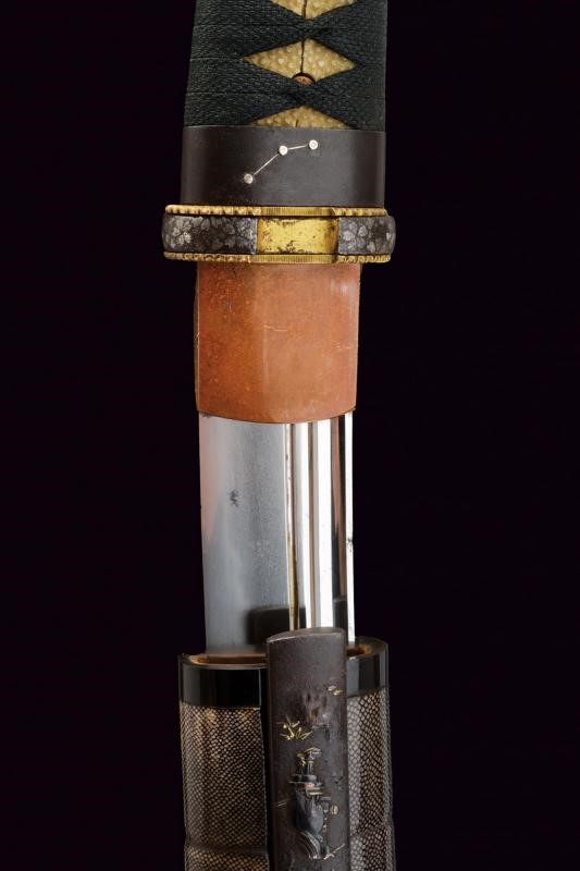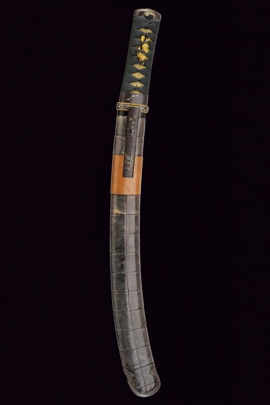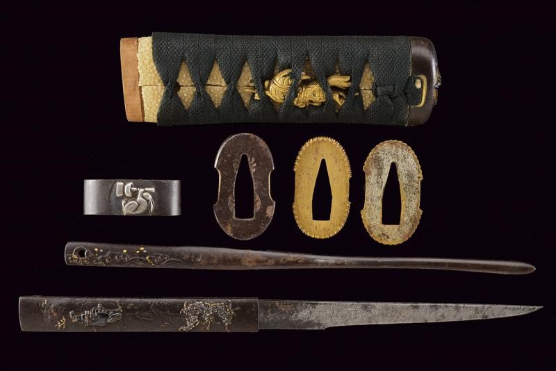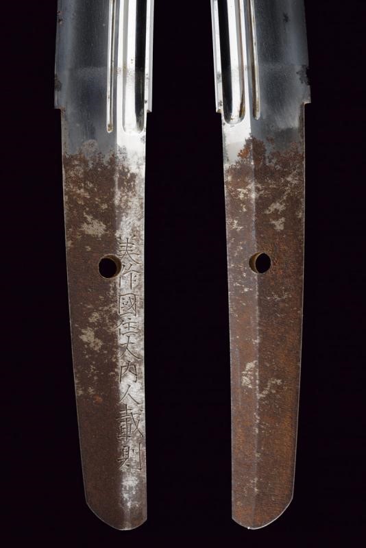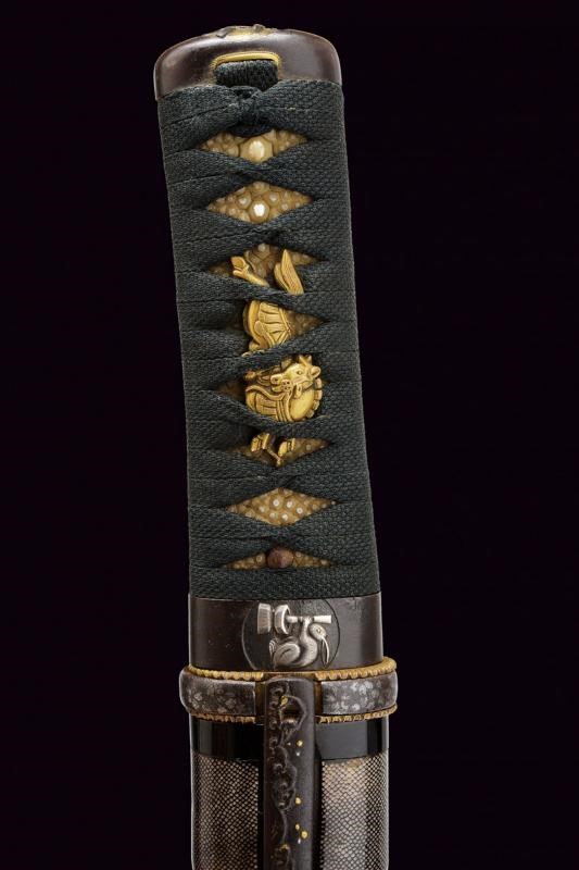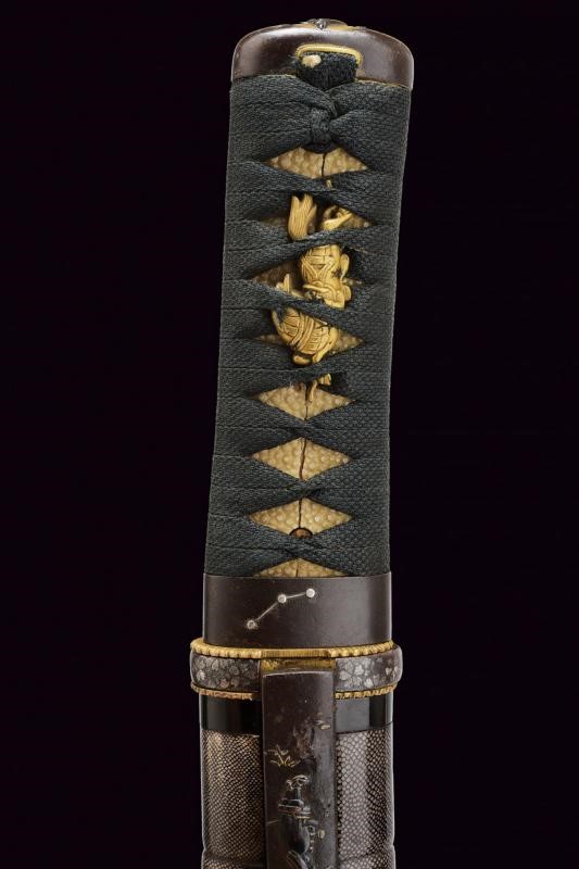 Tradizione Mino. Nagasa (34.2 cm), hamon: gunome, midare, notare e hada: itame, masame; boshi con piccolo chip, doppio hi, e habaki in shakudo. Nakago mei Mimasaka no kuni ju Ouchibito Toshinori con un mekugi-ana. Koshirae con piccola tsuba in ferro decorato a fiori in argento, fuchi in ferro con lepre in argento e costellazione stellare, kashira in ferro con volatile su fondo dorato, bellissimi menuki a forma di cavallo in metallo dorato. Saya rivestita di pelle di pesce e munita di ko-gatana mei con kozuka raffigurante un contadino sotto un albero in fiore con tarsie in oro ed argento. Kogai decorato a onde e con puntini in oro. Epoca fine Edo.