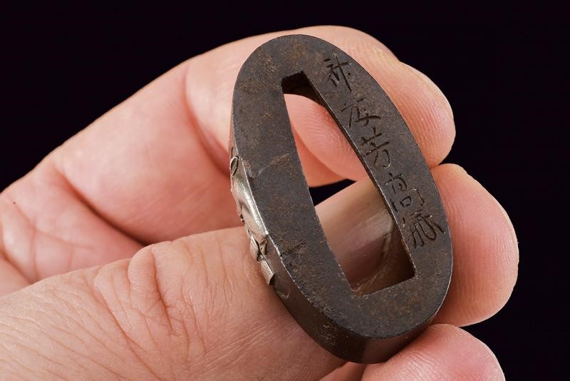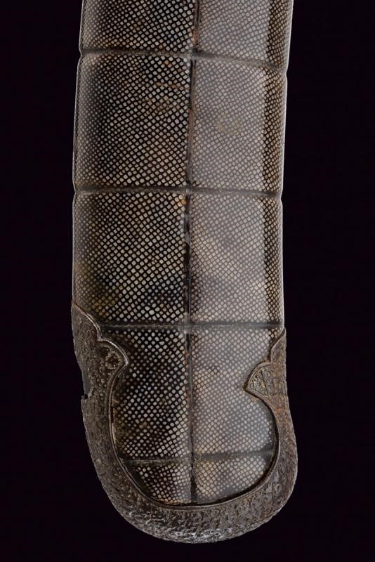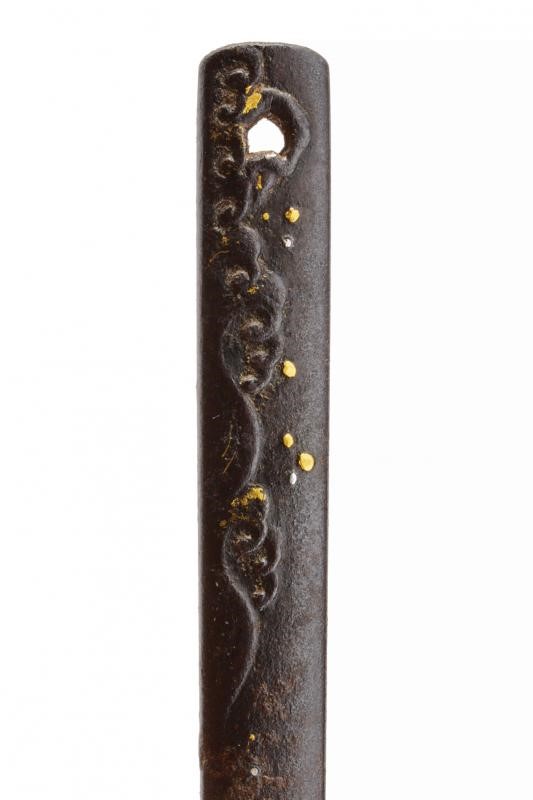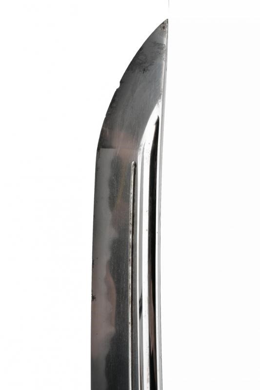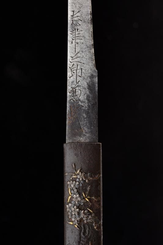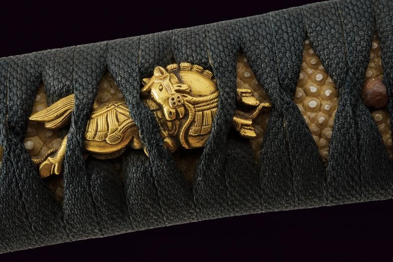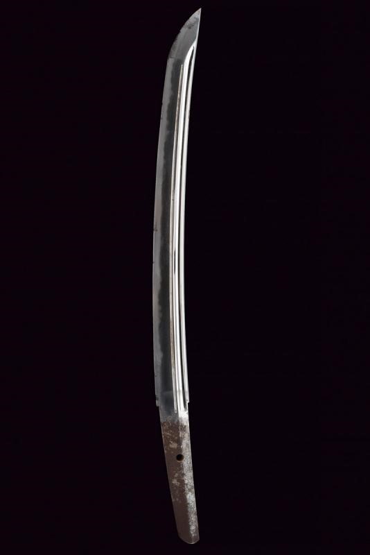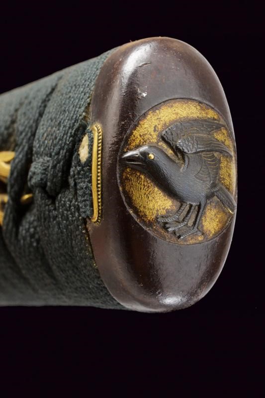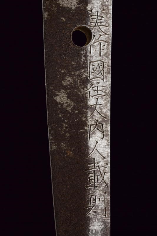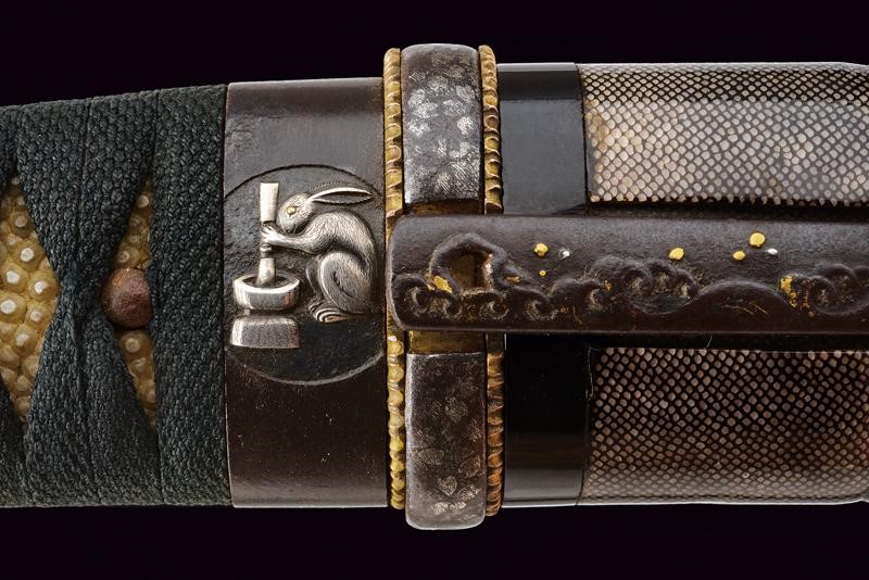 Tradizione Mino. Nagasa (34.2 cm), hamon: gunome, midare, notare e hada: itame, masame; boshi con piccolo chip, doppio hi, e habaki in shakudo. Nakago mei Mimasaka no kuni ju Ouchibito Toshinori con un mekugi-ana. Koshirae con piccola tsuba in ferro decorato a fiori in argento, fuchi in ferro con lepre in argento e costellazione stellare, kashira in ferro con volatile su fondo dorato, bellissimi menuki a forma di cavallo in metallo dorato. Saya rivestita di pelle di pesce e munita di ko-gatana mei con kozuka raffigurante un contadino sotto un albero in fiore con tarsie in oro ed argento. Kogai decorato a onde e con puntini in oro. Epoca fine Edo.