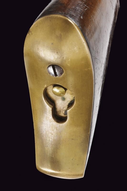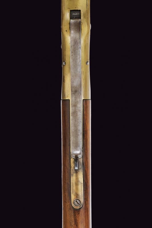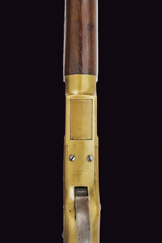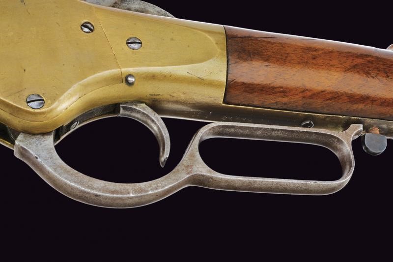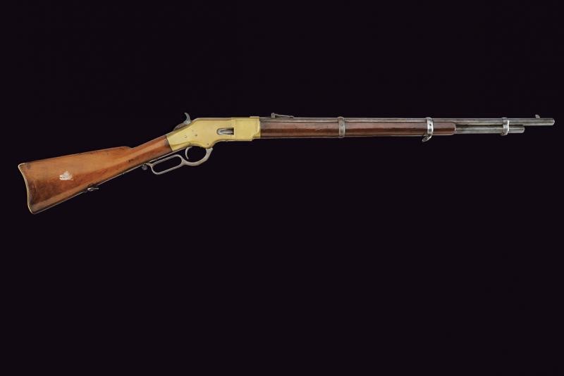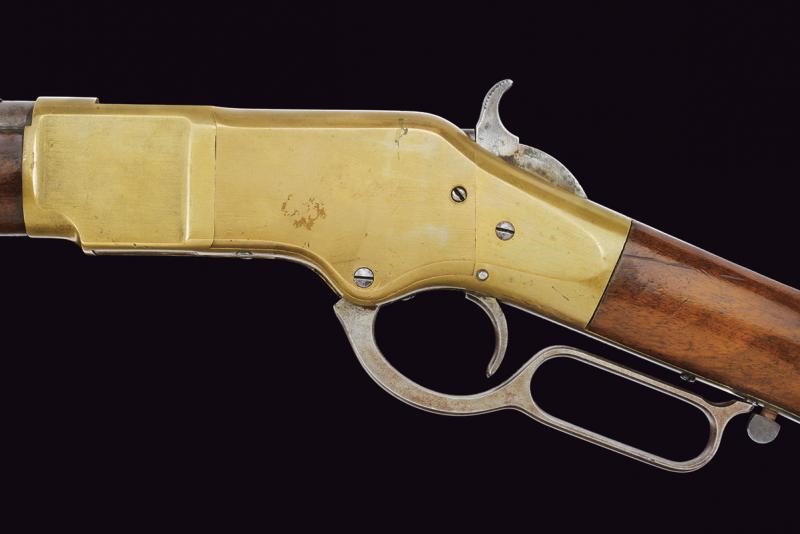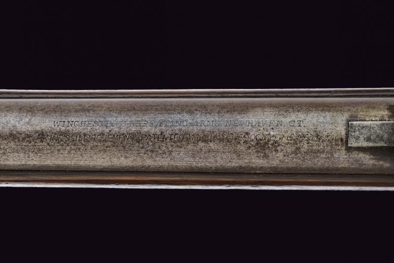 Canna tonda rigata, da 27" (rigatura visibile, incrostazioni e intaccature all'interno), dotata di mirino, alzo abbattibile e regolabile, marcata con indirizzo della ditta, "KING'S IMPROVEMENT" e brevetti del 1866 e 1860, cal. 44 rimfire. Punzone "S". Castello liscio in ottone. Il codolo inferiore con riparazione e matricola probabilmente ritimbrata "21xxx". Il fermo della leva non aggancia la linguetta di arresto. Meccanica funzionante, lievemente difficoltoso il rientro della leva di caricamento. Calcio ed astina in noce, entrambi lisci, con segni d'uso e del tempo. Serbatoio tubolare, tre fascette reggicanna in ferro. Calciolo in ottone con scomparto, privo della bacchetta.