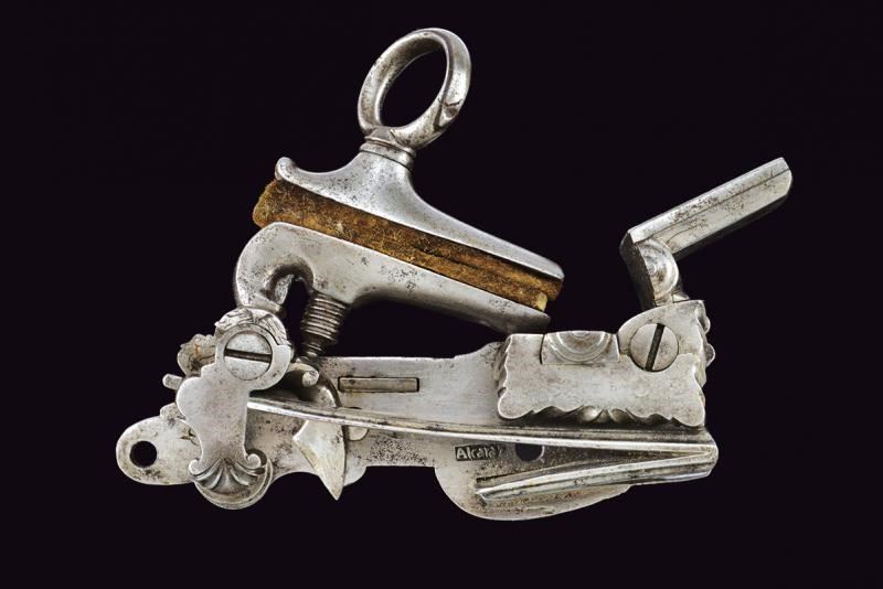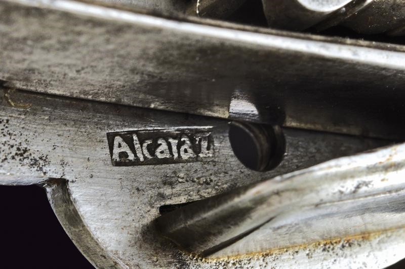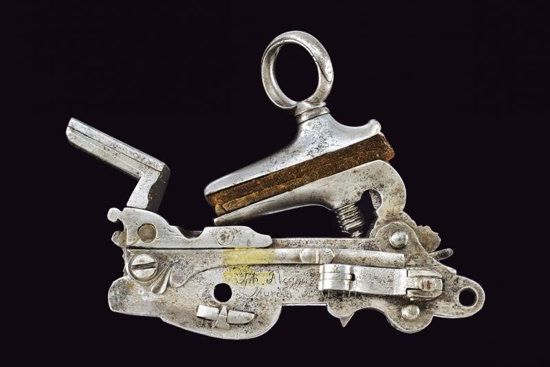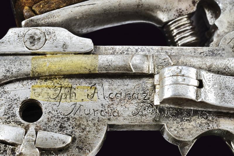 Cartella piatta con marca "ALCARAZ", la base della martellina e del cane con intagli a sgusci; grosse ganasce e anello del cane. L'interno reca la firma e la data "Jpti. Alcaraz / Murcia A° 1775 (?)".