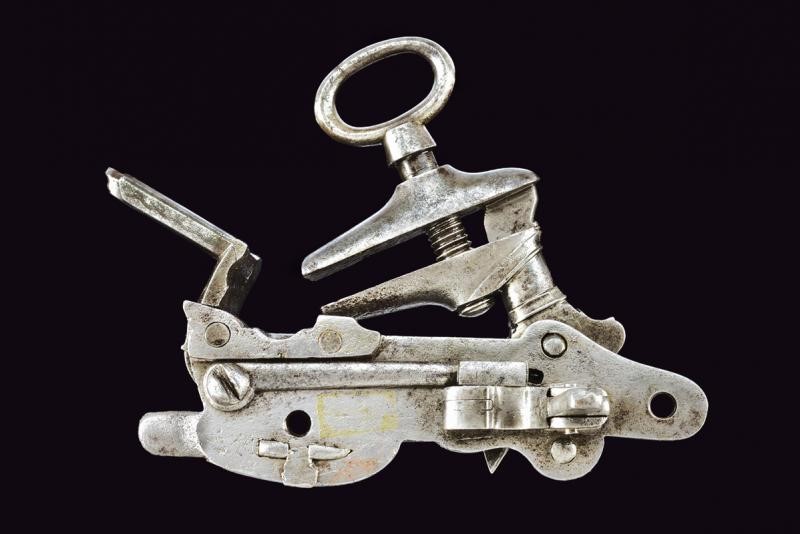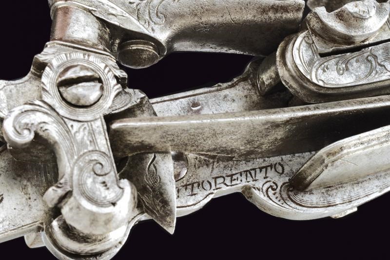 Cartella piatta con bordi incisi, la coda con fiore intorno al foro per la vite, firmata "PERE TORENTO", collo del cane, ganasce e piatto della martellina con incisioni a volute. Meccanica funzionante.