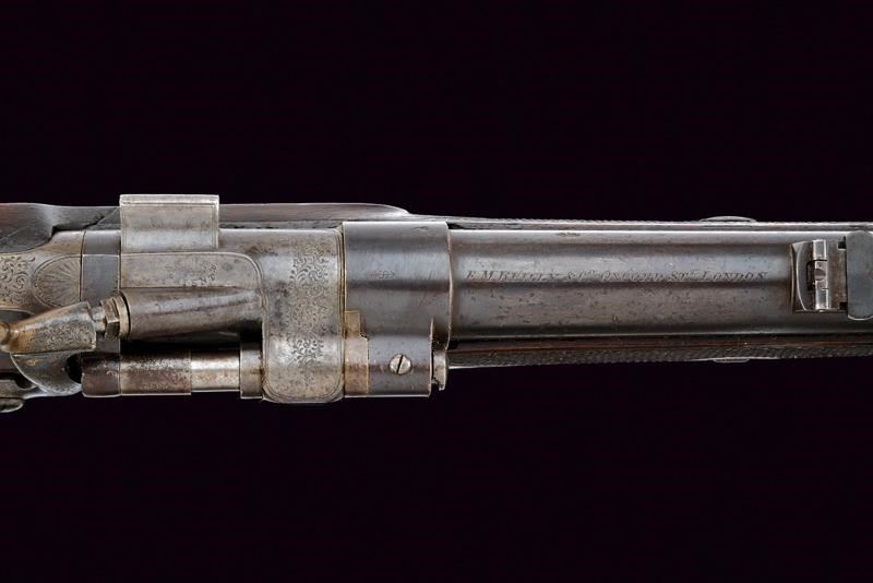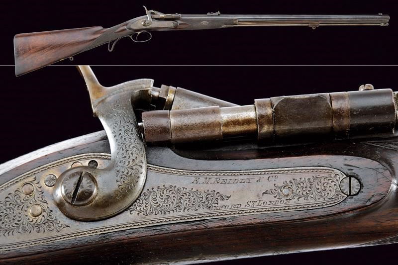 Canna tonda, rigata (anima pulita, rigatura ancora visibile), firmata alla base "F. M. REILLY & Co. OXFORD ST. LONDON", con punzoni del banco di Londra, alzo regolabile e mirino, cal. 14.5 mm in volata. Otturatore marcato "SNIDER PATENT", con punzoni del banco di prova di Londra e fini incisioni floreali. Meccanica funzionante. Codetta incisa. Batteria a molla in avanti firmata "E. M. REILLY& Co - OXFORD ST. LONDON" fra disegni floreali. Mezza cassa in legno con astina e collo zigrinati. Fornimenti in ferro decorati en suite. Le parti in ferro conservano gran parte della brunitura originale. Bacchetta in ferro.