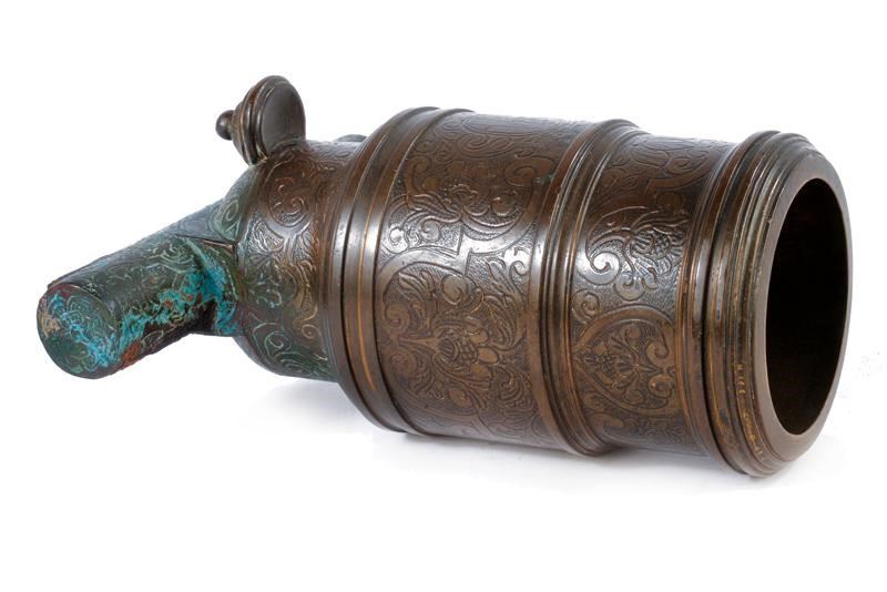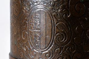 Struttura in bronzo di forma cilindrica, di sezione maggiore nel primo segmento e con un lungo collo in culatta e gioia di bocca in volata. Alla base uno scodellino posto in posizione perpendicolare al fusto. Sul fondo due orecchioni cilindrici. La superficie tutta incisa a fiorami e cornici. Recante al dorso un emblema araldico coronato.