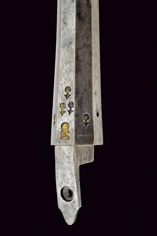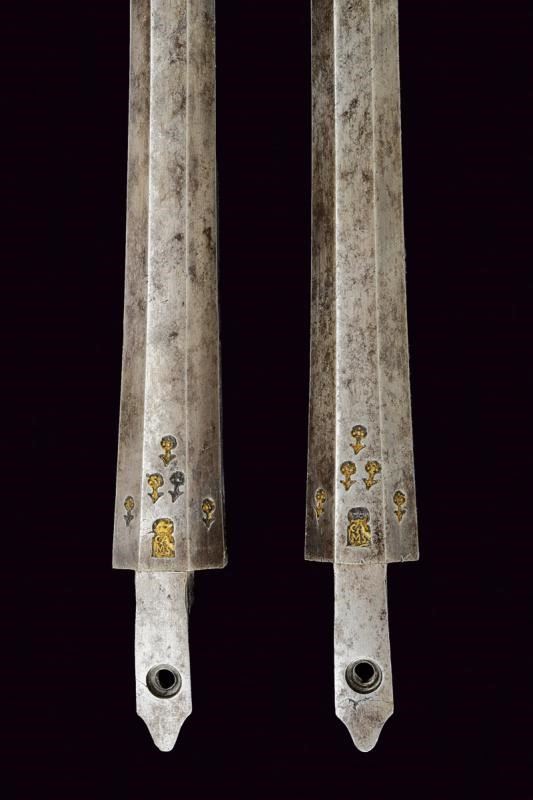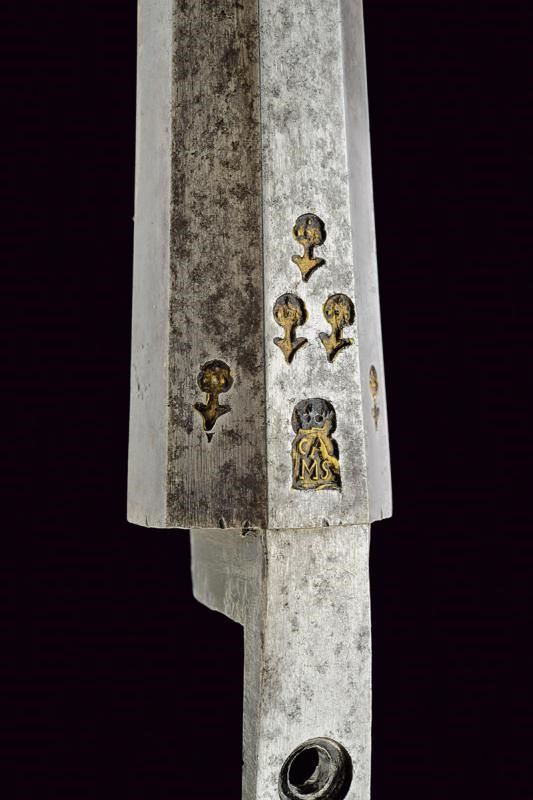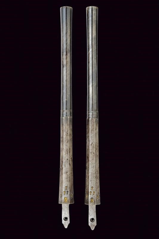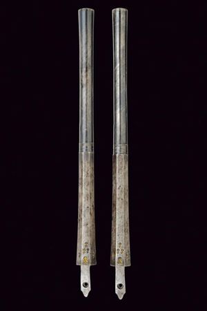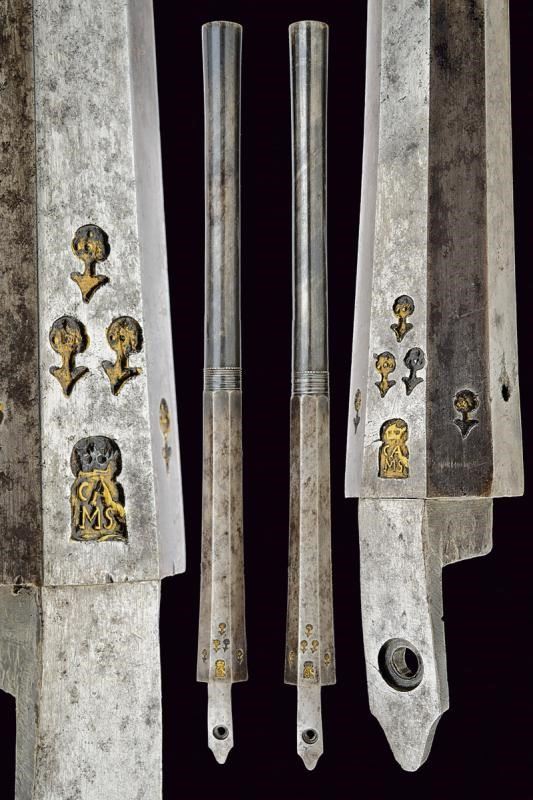 Canne tonde lisce, a due ordini, i primi segmenti di sezione ottagonale con marca "CAMS" circondata da frecce con coda circolare, il tutto rimesso in ottone; al cambio tre anellature, due lisce e una mista composta da tre anelli e un segmento a tacche; in seguito di sezione tonda e brunite (conservano ancora il 40% della brunitura originale); le volate leggermente strombate. Con codette lisce.