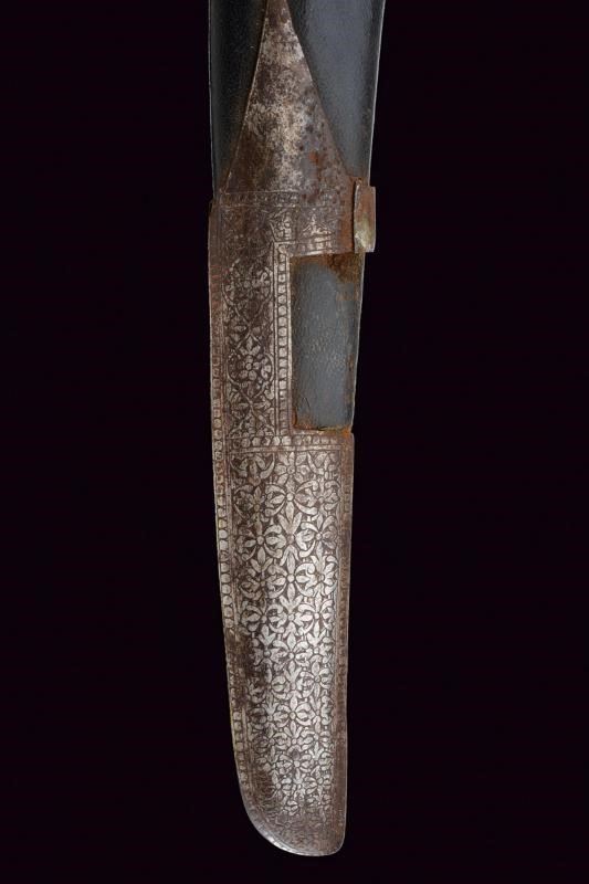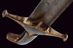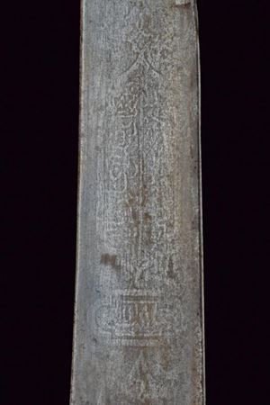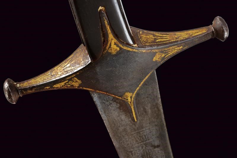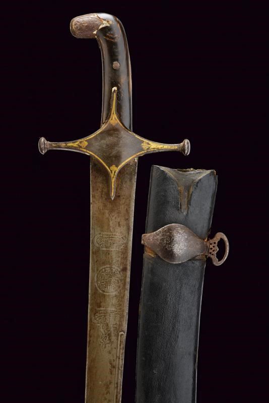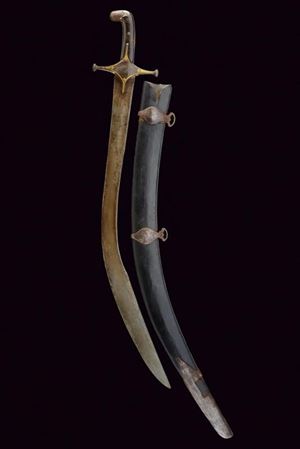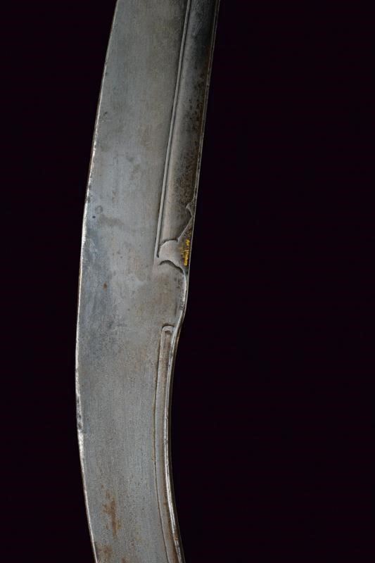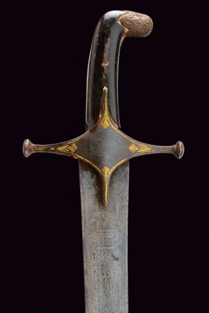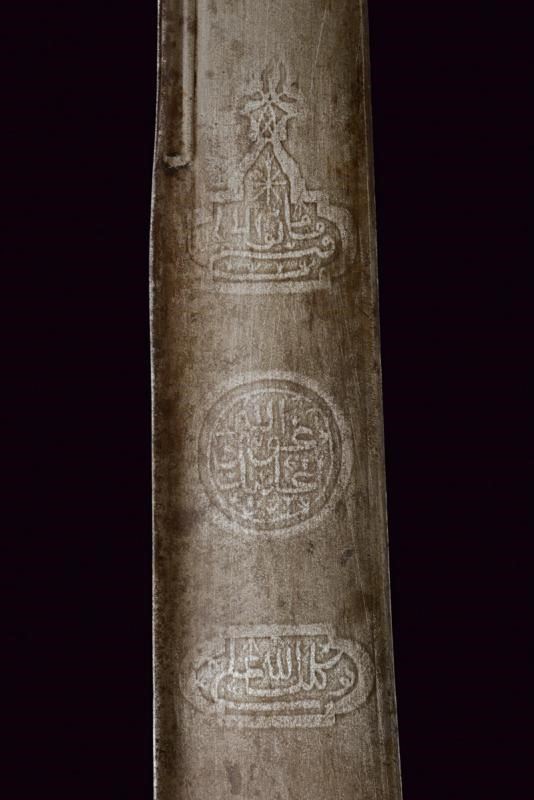 Larga lama curva a un filo e controfilo, in damasco grigio, con dorso a "T" leggermente nervato e con lievi resti di doratura, leggera scanalatura dorsale; la prima parte con tre cartigli sul lato di terza e due sul lato opposto (ancora visibili) con iscrizioni in caratteri arabi. Fornimento a croce in damasco con bordi decorati in oro. Guancette in corno di mucca con pomo angolato, in ferro, inciso a motivi floreali e con resti di doratura. Fodero in legno rivestito di cuoio, con fornimenti in ferro; il puntale finemente inciso a motivi floreali. Due anelli di sospensione.
