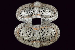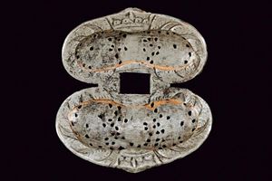 In ferro a due valve messe a giorno; quella anteriore leggermente più grande. Foro rettangolare al centro; la superficie esterna con finissimi intagli in bassorilievo raffiguranti elementi floreali, su ogni valva tre busti, i bordi con rame.