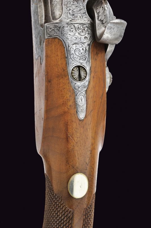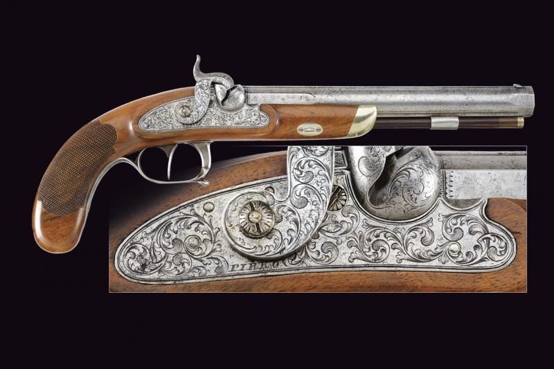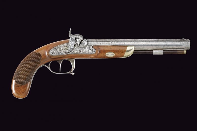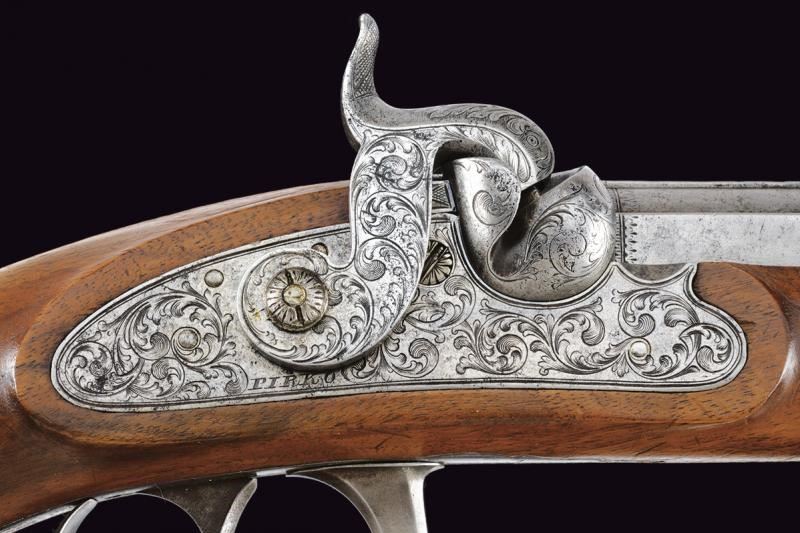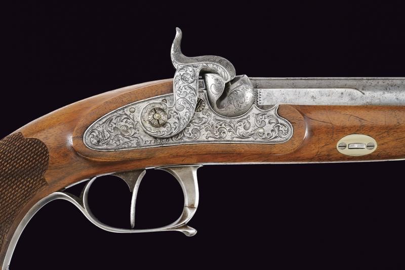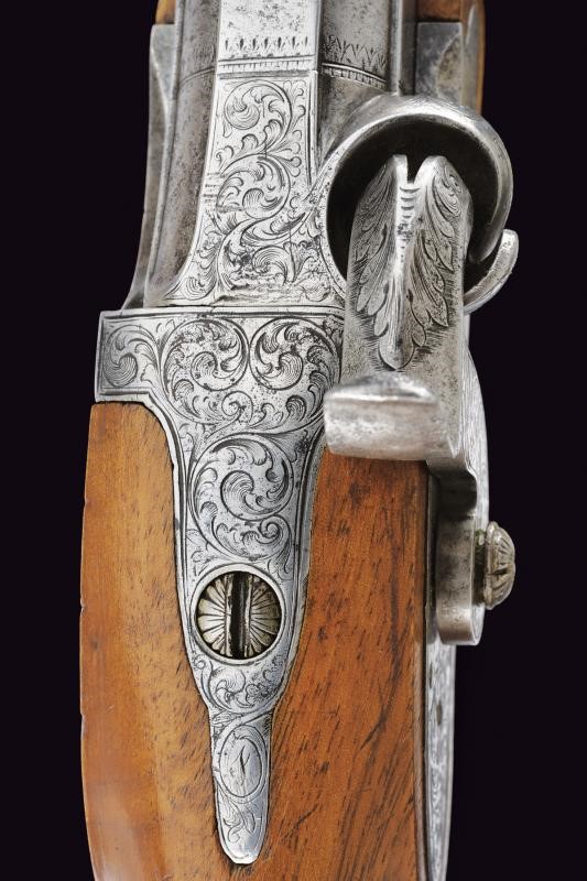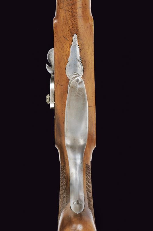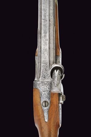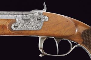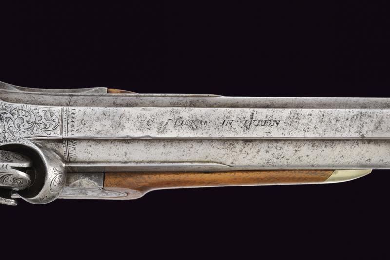 Canna liscia, tonda, con base quadra ed incisa a motivi floreali, l'ampia bindella firmata "C. PIRKO IN WIEN", la volata ottagonale e munita di mirino, cal. 16 mm; larga codetta decorata a motivi floreali. Batteria a molla in avanti firmata "PIRKO" e decorata en suite, bel porta-pistone emisferico con parascintille. Mezza cassa in legno di frutto con calcio zigrinato. Contropiastra incisa e marcata "WIEN", ponticello in ferro liscio, muso in ottone. Bacchetta in legno (tenuta ben ferma tramite una scanalatura sotto alla canna) con battipalla in argento inciso e base con cavastracci. Il dorso con scudetto ovale.