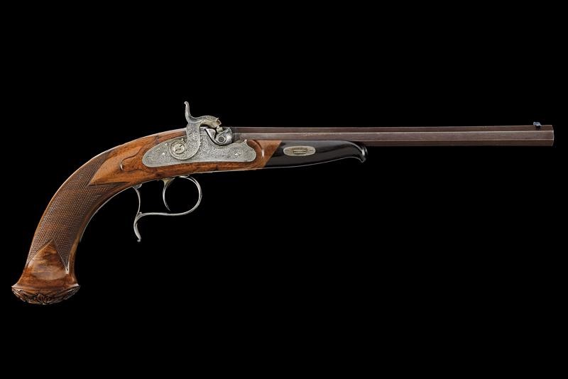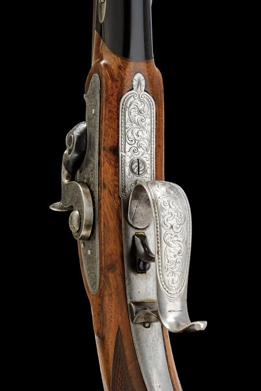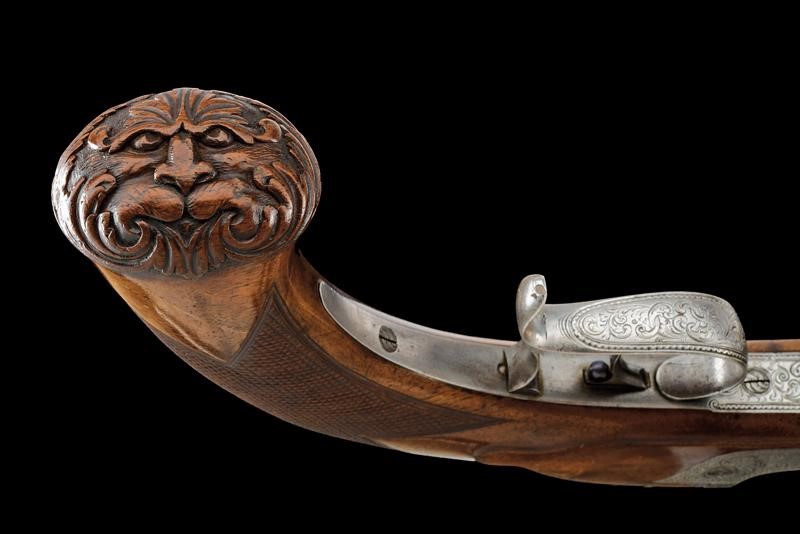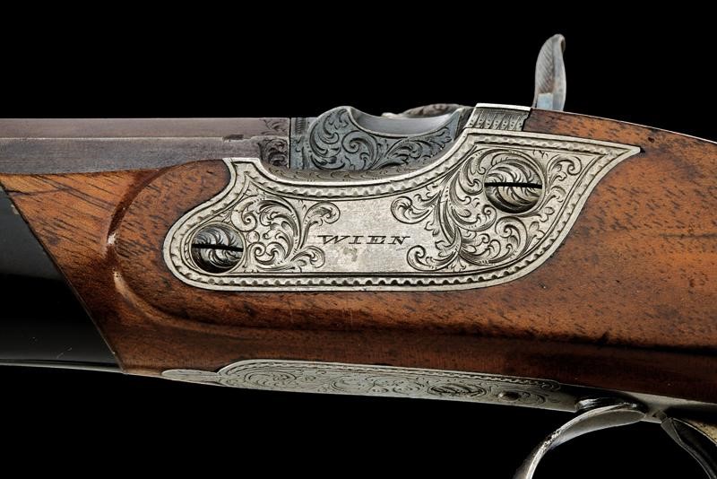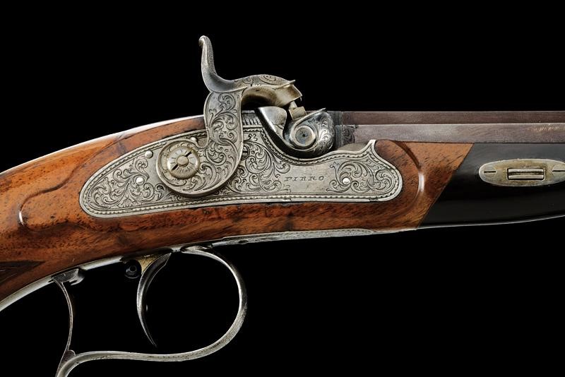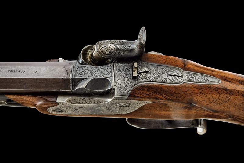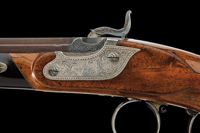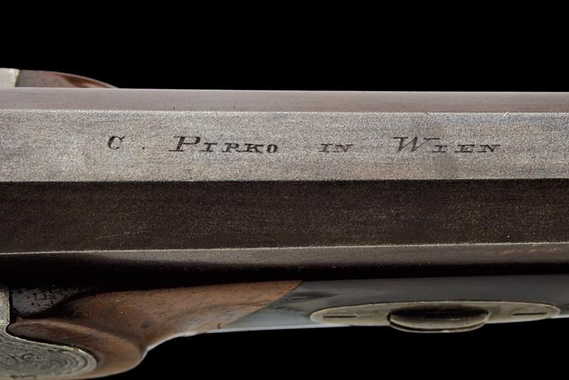 Canna rigata (anima pulita, rigatura visibile), brunita, di sezione ottagonale, con decorazioni a volute alla base, seguite dalla firma "C. PIRKO IN WIEN"; in volata mirino di precisione, calibro 7.2 mm. Codetta incisa en suite alla base e munita di alzo regolabile tramite vite. Batteria a luminello a molla in avanti, con cartella recante bordi delineati e la firma "PIRKO"; la sua superficie totalmente incisa a racemi e volute, come anche quella del cane. Luminello con parascintille. Mezza cassa in legno con parte anteriore in corno, calcio zigrinato e coccia scolpita con bel mascherone, allargata verso la mano per favorire una migliore presa. Fornimenti in ferro incisi en suite, la contropiastra marcata "IN WIEN". Completa di bacchetta disgiunta, inserita all'interno della canna, in legno con base a ciambella e cavastracci svitabile in ottone e ferro.
