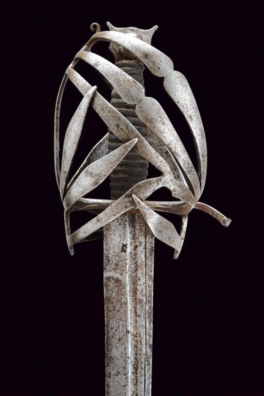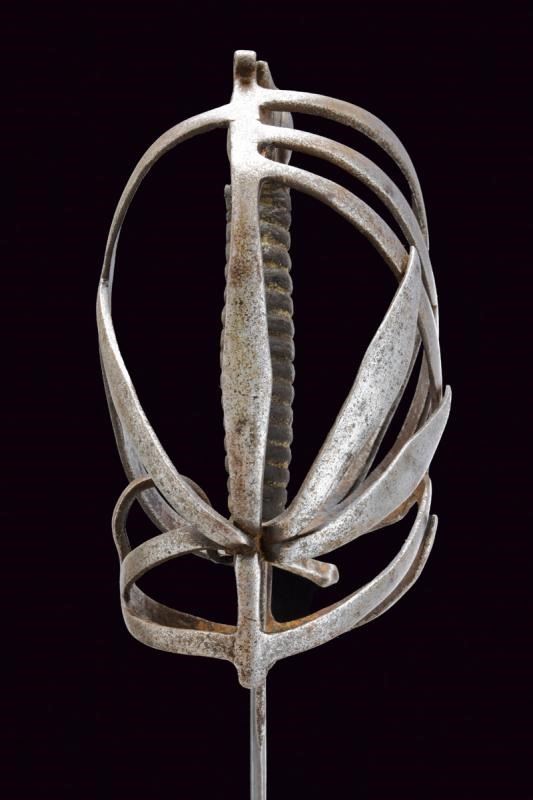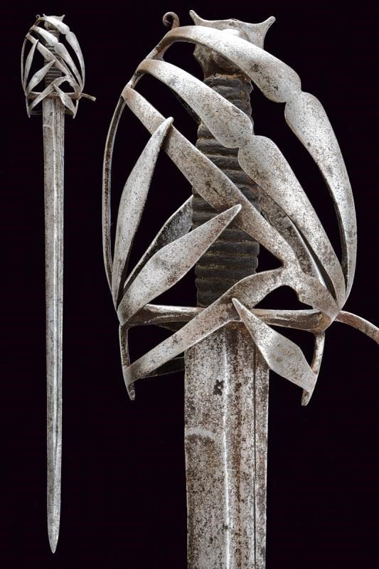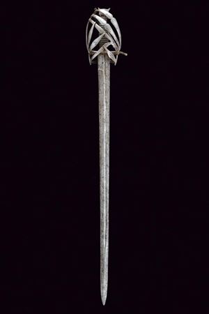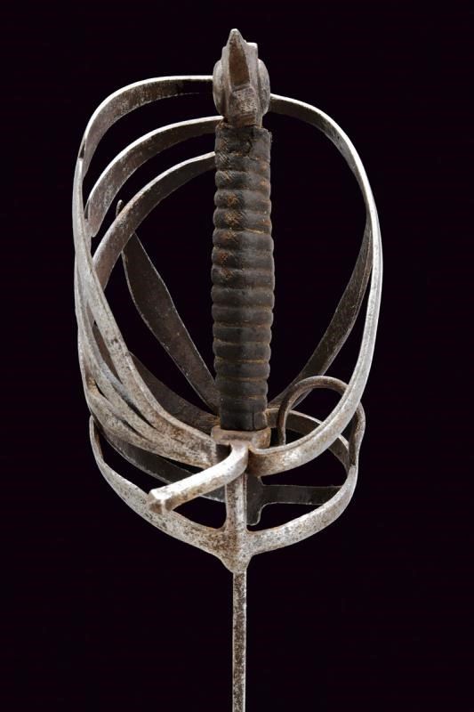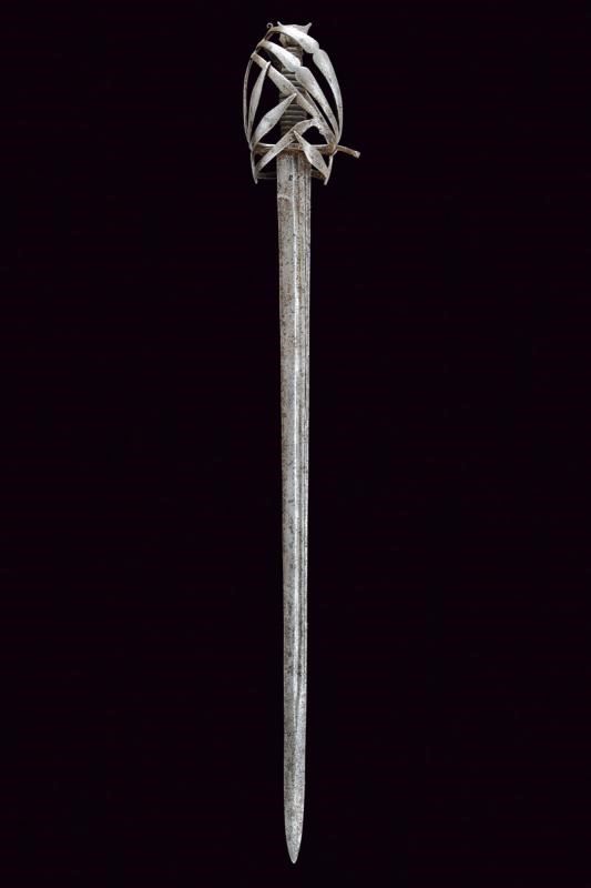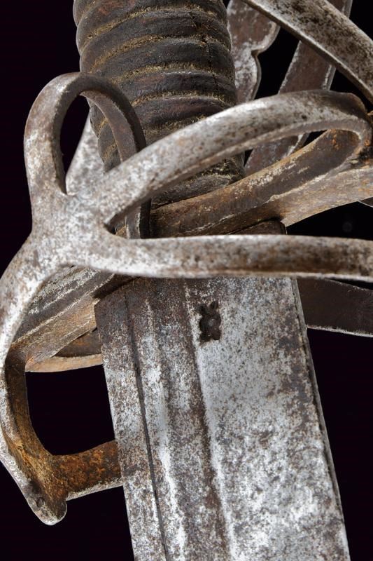 Larga lama dritta a un filo e controfilo con scanalatura e delineatura vicino al dorso. Il tallone con marca veneta su entrambi i lati. Fornimento di forma tipica in ferro a gabbia, ponticello, anello da pollice e pomo a testa di gatto. Impugnatura in legno rivestita di cuoio.