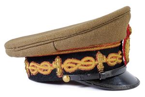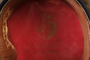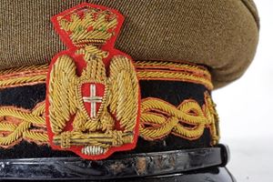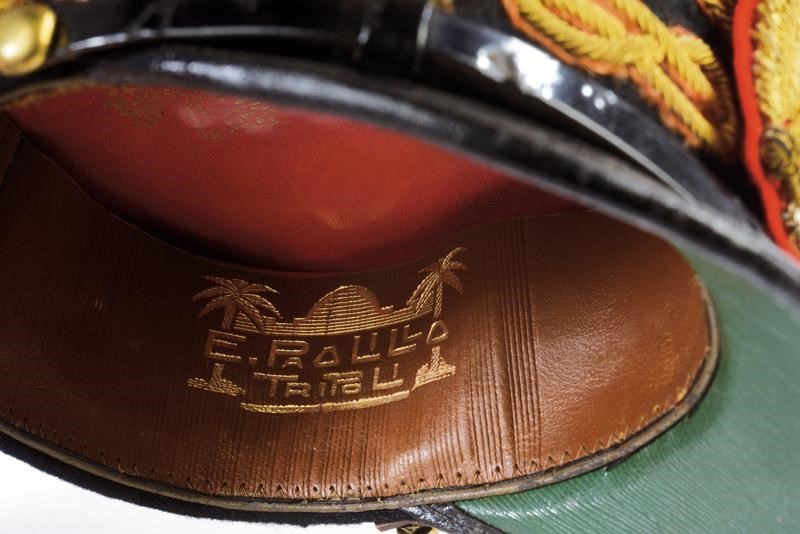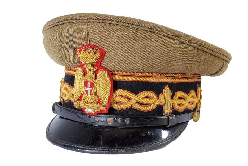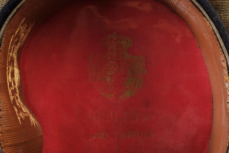 Modello in scala, da esposizione sartoriale, del cappello a visiera da funzionario coloniale, in tessuto grigio verde, con fascia recante due galloni di grado e nodi di Savoia intervallati da fasci orizzontali in canutiglia dorata; fregio anteriore con aquila coronata caricata da scudo sabaudo in grovigliola dorata su panno rosso. Visiera rigida e soggolo in cuoio. All'interno alluda in pelle marrone e marca della sartoria "E. PAOLILLO TRIPOLI".